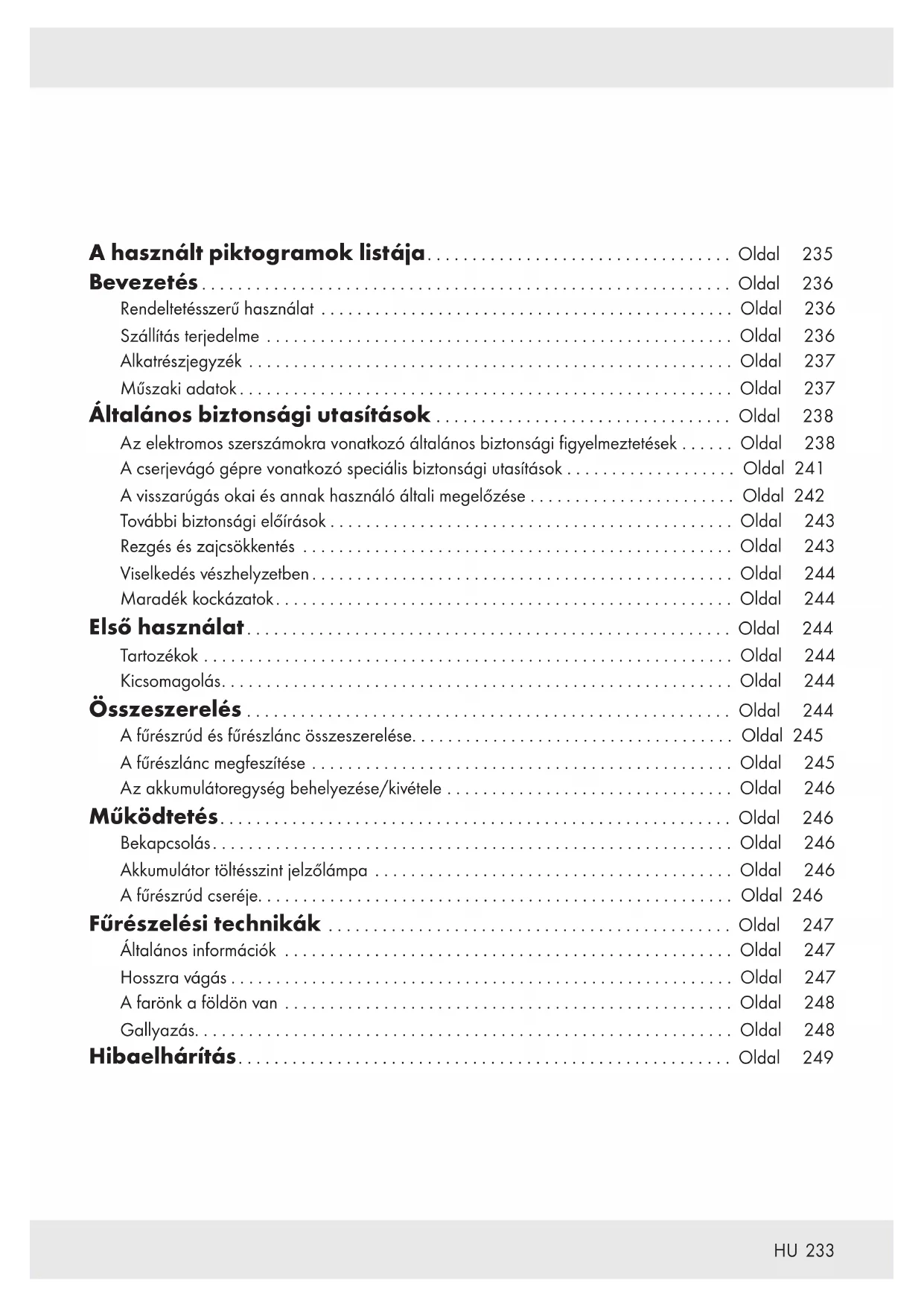 A használt piktogramok listája.................................. Oldal 235 Bevezetés ........................................................... Oldal 236 Rendeltetésszerű használat .............................................. Oldal 236 Szállítás terjedelme .................................................... Oldal 236 Alkatrészjegyzék ...................................................... Oldal 237 Műszaki adatok ....................................................... Oldal 237 Általános biztonsági utasítások ................................. Oldal 238 Az elektromos szerszámokra vonatkozó általános biztonsági figyelmeztetések ...... Oldal 238 A cserjevágó gépre vonatkozó speciális biztonsági utasítások . . . . . . . . . . . . . . . . . . . Oldal 241 A visszarúgás okai és annak használó általi megelőzése ....................... Oldal 242 További biztonsági előírások ............................................. Oldal 243 Rezgés és zajcsökkentés ................................................ Oldal 243 Viselkedés vészhelyzetben............................................... Oldal 244 Maradék kockázatok................................................... Oldal 244 Első használat...................................................... Oldal 244 Tartozékok ........................................................... Oldal 244 Kicsomagolás......................................................... Oldal 244 Összeszerelés ...................................................... Oldal 244 A fűrészrúd és fűrészlánc összeszerelése.................................... Oldal 245 A fűrészlánc megfeszítése ............................................... Oldal 245 Az akkumulátoregység behelyezése/kivétele ................................ Oldal 246 Működtetés......................................................... Oldal 246 Bekapcsolás.......................................................... Oldal 246 Akkumulátor töltésszint jelzőlámpa ........................................ Oldal 246 A fűrészrúd cseréje..................................................... Oldal 246 Fűrészelési technikák ............................................. Oldal 247 Általános információk .................................................. Oldal 247 Hosszra vágás ........................................................ Oldal 247 A farönk a földön van .................................................. Oldal 248 Gallyazás............................................................ Oldal 248 Hibaelhárítás....................................................... Oldal 249234