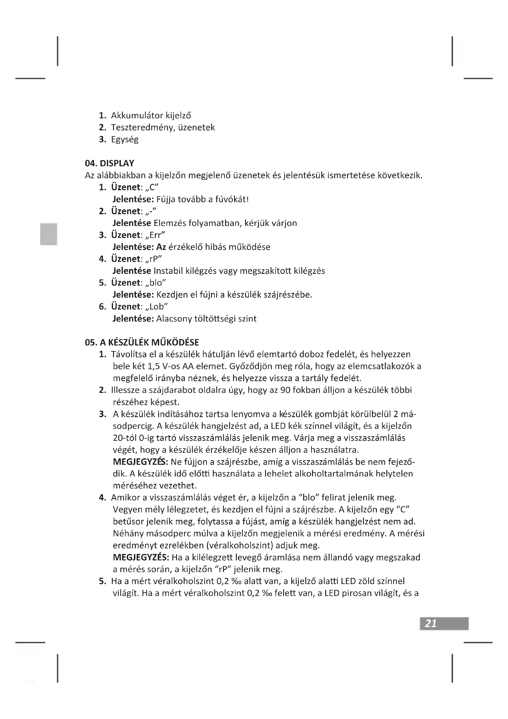 sodpercig. A készülék hangjelzést ad, a LED kék színnel világít, és a kijelzőn 20-tól 0-ig tartó visszaszámlálás jelenik meg. Várja meg a visszaszámlálás végét, hogy a készülék érzékelője készen álljon a használatra. MEGJEGYZÉS: Ne fújjon a szájrészbe, amíg a visszaszámlálás be nem fejező- dik. A készülék idő elő használata a lehelet alkoholtartalmának helytelen méréséhez vezethet.