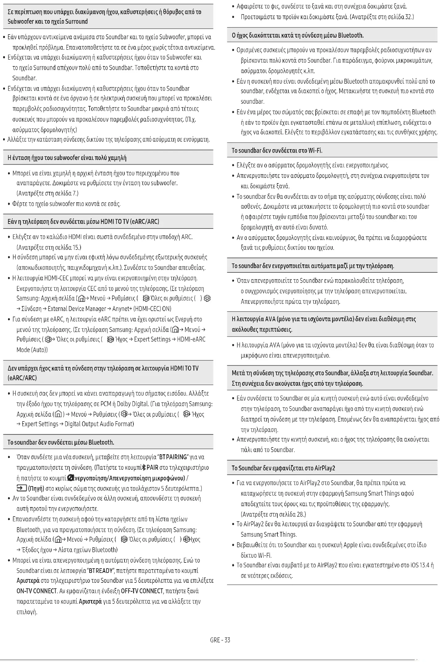 - Το Soundbar είναι συμβατό με το AirPlay2 που είναι εγκατεστημένο στο iOS 13.4 ή σε νεότερες εκδόσεις.HUN - 2 TARTALOM 01 A komponensek ellenőrzése 3 02 A termék áttekintése 4 A Soundbar felső panelje. . . . . . . . . . . . . . . . . . . . . . . . . . . . . . . . . . . . . . . . . . . .4 A Soundbar alsó panelje . . . . . . . . . . . . . . . . . . . . . . . . . . . . . . . . . . . . . . . . . . . .5 03 A Soundbar távirányító használata 6 Az elemek behelyezése a távirányító használata előtt (2 db AAA elem) . . . . . . . . . . . . . . . . . . . . . . . . . . . . . . . . . . . . . . . . . . . . . . . . . . . .6 A Távvezérlő Használatának Módja . . . . . . . . . . . . . . . . . . . . . . . . . . . . . . . . . .6 Aktív beszédhang-erősítővel (AVA) . . . . . . . . . . . . . . . . . . . . . . . . . . . . . . . . . .8 A Rejtett Gombok használata (Gombok egynél több funkcióval) . . . . . . .8 A különféle hangeffektusmódok kimeneti műszaki adatai . . . . . . . . . . . . .8 A Soundbar hangerejének szabályozása a televízió távirányítójával . . .10 04 A Soundbar csatlakoztatása 11 Az áramellátás és az egységek csatlakoztatása. . . . . . . . . . . . . . . . . . . . . . 11 ‒ A hangszórók ajánlott elrendezése . . . . . . . . . . . . . . . . . . . . . . . . . . . . . . 12 ‒ Térhatású hangszóró mód (csak HW-Q9**C, HW-Q9**GC) . . . . . . . . 12 ‒ A mélysugárzó és a térhatású hangszórók manuális csatlakoztatása . . . . . . . . . . . . . . . . . . . . . . . . . . . . . . . . . . . . . . . . . . . . . . . . 13 ‒ LED-jelzőlámpák a mélysugárzó és a térhatású hangszórók hátulján . . . . . . . . . . . . . . . . . . . . . . . . . . . . . . . . . . . . . . . . . . . . . . . . . . . . . . 14 05 Csatlakoztatás TV-hez 15 A HDMI ARC-t (Audio Return Channel) támogató TV csatlakoztatása. . . 15 Csatlakoztatás optikai kábellel . . . . . . . . . . . . . . . . . . . . . . . . . . . . . . . . . . . . .16 Csatlakoztatás Bluetooth-on keresztül. . . . . . . . . . . . . . . . . . . . . . . . . . . . . . 17 Csatlakoztatás Wi-Fi-n. . . . . . . . . . . . . . . . . . . . . . . . . . . . . . . . . . . . . . . . . . . . .19 A Q-Symphony funkció használata. . . . . . . . . . . . . . . . . . . . . . . . . . . . . . . . . .20 A SpaceFit Sound használata . . . . . . . . . . . . . . . . . . . . . . . . . . . . . . . . . . . . . . . 21 06 Csatlakoztatás Külső Eszközhöz 22