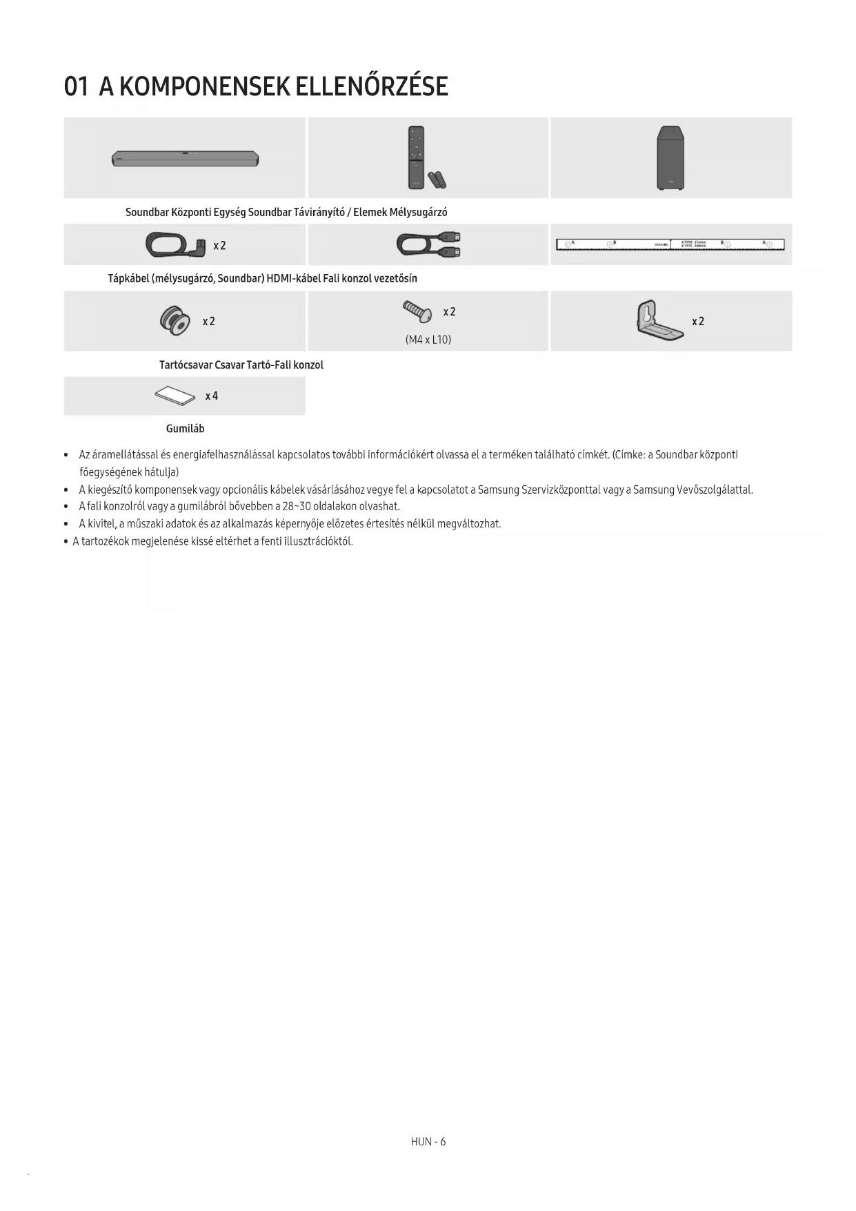 VOL WOOFER SOUNDBAR SOUND MODE PAIR Soundbar Központi Egység Soundbar Távirányító / Elemek Mélysugárzó x 2 Tápkábel (mélysugárzó, Soundbar) HDMI-kábel Fali konzol vezetősín x 2 x 2 (M4 x L10) x 2 Tartócsavar Csavar Tartó-Fali konzol x 4 Gumiláb