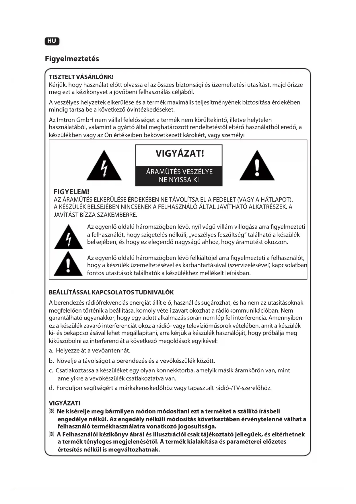 99HU TISZTELT VÁSÁRLÓNK! Kérjük, hogy használat előtt olvassa el az összes biztonsági és üzemeltetési utasítást, majd őrizze meg ezt a kézikönyvet a jövőbeni felhasználás céljából. A veszélyes helyzetek elkerülése és a termék maximális teljesítményének biztosítása érdekében mindig tartsa be a következő óvintézkedéseket. Az Imtron GmbH nem vállal felelősséget a termék nem körültekintő, illetve helytelen használatából, valamint a gyártó által meghatározott rendeltetéstől eltérő használatból eredő, a készülékben vagy az Ön értékeiben bekövetkezett károkért, vagy személyi Figyelmeztetés FIGYELEM! AZ ÁRAMÜTÉS ELKERÜLÉSE ÉRDEKÉBEN NE TÁVOLÍTSA EL A FEDELET (VAGY A HÁTLAPOT). A KÉSZÜLÉK BELSEJÉBEN NINCSENEK A FELHASZNÁLÓ ÁLTAL JAVÍTHATÓ ALKATRÉSZEK. A JAVÍTÁST BÍZZA SZAKEMBERRE. Az egyenlő oldalú háromszögben lévő, nyíl végű villám villogása arra gyelmezteti a felhasználót, hogy szigetelés nélküli, „veszélyes feszültség” található a készülék belsejében, és hogy ez elegendő nagyságú ahhoz, hogy áramütést okozzon. Az egyenlő oldalú háromszögben lévő felkiáltójel arra gyelmezteti a felhasználót, hogy a készülék üzemeltetésével és karbantartásával (szervizelésével) kapcsolatban fontos utasítások találhatók a készülékhez mellékelt leírásban. BEÁLLÍTÁSSAL KAPCSOLATOS TUDNIVALÓK A berendezés rádiófrekvenciás energiát állít elő, használ és sugározhat, és ha nem az utasításoknak megfelelően történik a beállítása, komoly vételi zavart okozhat a rádiókommunikációban. Nem garantálható ugyanakkor, hogy egy adott alkalmazás során nem lép fel interferencia. Amennyiben ez a készülék zavaró interferenciát okoz a rádió- vagy televízióműsorok vételében, amit a készülék ki- és bekapcsolásával lehet megállapítani, arra kérjük a készülék használóját, hogy próbálja meg kiküszöbölni az interferenciát a következő megoldások egyikével: a. Helyezze át a vevőantennát. b. Növelje a távolságot a berendezés és a vevőkészülék között. c. Csatlakoztassa a készüléket egy olyan konnekktorba, amelyik másik áramkörön van, mint amelyikre a vevőkészülék csatlakoztatva van. d. Forduljon segítségért a márkakereskedőhöz vagy tapasztalt rádió-/TV-szerelőhöz. VIGYÁZAT! ※ Ne kísérelje meg bármilyen módon módosítani ezt a terméket a szállító írásbeli engedélye nélkül. Az engedély nélküli módosítás következtében érvénytelenné válhat a felhasználó termékhasználatra vonatkozó jogosultsága. ※ A Felhasználói kézikönyv ábrái és illusztrációi csak tájékoztató jellegűek, és eltérhetnek a termék tényleges megjelenésétől. A termék kialakítása és paraméterei előzetes értesítés nélkül is megváltozhatnak. VIGYÁZAT!