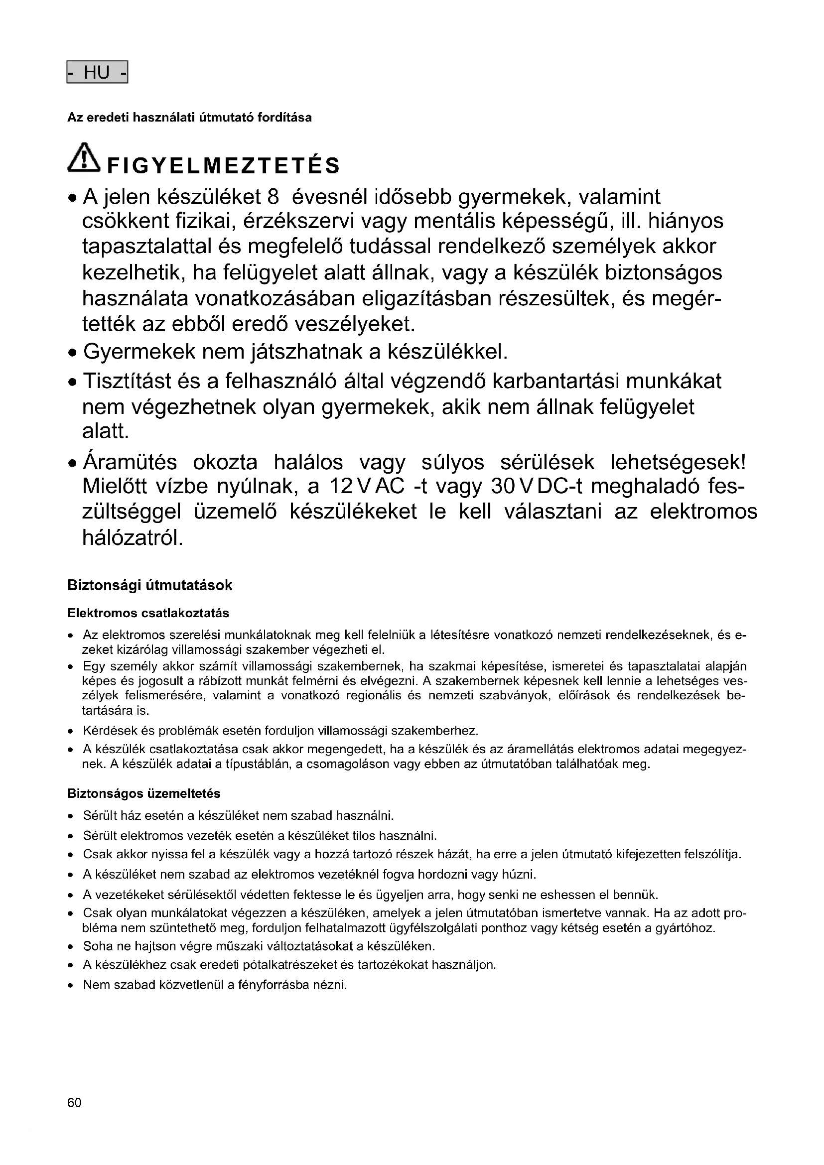 - Áramütés okozta halálos vagy súlyos sérülések lehetségesek! Mielőtt vízbe nyúlnak, a 12 V AC -t vagy 30 V DC-t meghaladó fes- zültséggel üzemelő készülékeket le kell választani az elektromos hálózatról.