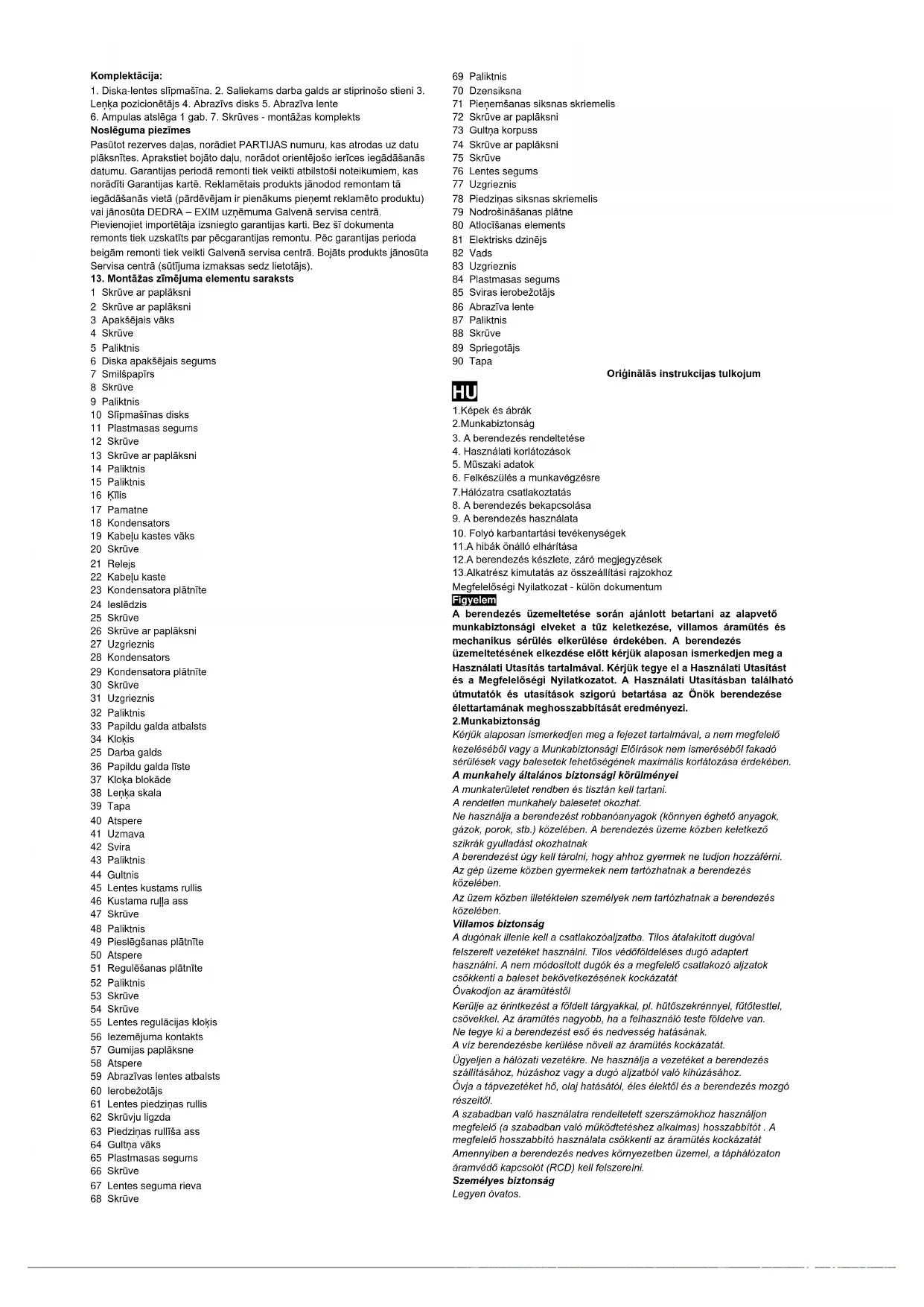 1 Alátétes csavar 2 Alátétes csavar 3 Alsó fedél 4 Csavar 5 Alátét 6 Tárcsa alsó védőlemez 7 Csiszolópapír 8 Csavar 9 Alátét 10 Csiszoló tárcsa 11 Műanyag védőburkolat 12 Csavar 13 Alátétes csavar 14 Alátét 15 Alátét 16 Ék 17 Talp 18 Kondenzátor 19 Kábeldoboz fedél 20 Csavar 21 Relé 22 Kábeldoboz 23 Kondenzátor lemezke 24 Kapcsoló 25 Csavar 26 Alátétes csavar 27 Anyacsavar 28 Kondenzátor 29 Kondenzátor lemezke 30 Csavar 31 Anyacsavar 32 Alátét 33 Kiegészítő munkapad szupport 34 Szabályozó gomb 35 Munkapad 36 Kiegészítő munkapad léc 37 Szabályozó gomb retesz 38 Szögmérő skála 39 Tüske 40 Rugó 41 Hüvely 42 Emelőkar 43 Alátét 44 Csapágy 45 Szalag meghajtott görgő 46 Meghajtó görgő tengely47 Csavar 48 Alátét 49 Csatlakozó lemezke 50 Rugó 51 Szabályozó lemezke 52 Alátét 53 Csavar 54 Csavar 55 Szalag szabályozó gomb 56 Földelés fül 57 Gumi alátét 58 Rugó 59 Csiszolószalag szupport 60 Ütköző 61 Szalag meghajtó görgő 62 Csavar fészek 63 Meghajtó görgő tengely 64 Csapágy fedél 65 Műanyag védőburkolat 66 Csavar 67 Szalag védőburkolat csap 68 Csavar 69 Alátét 70 Meghajtó szíj 71 Meghajtott szíjtárcsa 72 Alátétes csavar 73 Csapágy test 74 Alátétes csavar 75 Csavar 76 Szalag védőburkolat 77 Anyacsavar 78 Meghajtó szíjtárcsa 79 Biztosító lemez 80 Törésgátló 81 Villanymotor 82 Vezeték 83 Anyacsavar 84 Műanyag védőburkolat 85 Kar végállás ütköző 86 Csiszolószalag 87 Alátét 88 Csavar 89 Feszítő 90 Tüske Traducerea instrucțiunii originale FRgfdgdfg 1.Photos et dessins 2.Sécurité du travail 3.Utilisation prévue de l’appareil 4Limitations d’utilisation