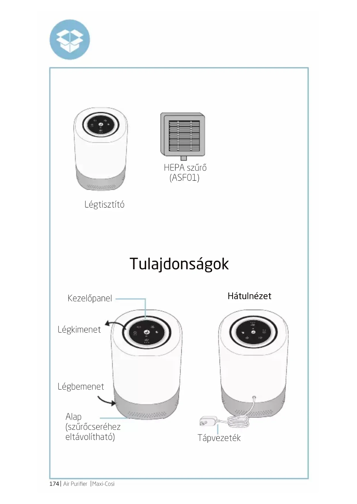 Maxi-Cosi Tulajdonságok Légtisztító HEPA szűrő (ASF01) Alap (szűrőcseréhez eltávolítható) Kezelőpanel Hátulnézet Légbemenet Légkimenet TápvezetékMaxi-Cosi