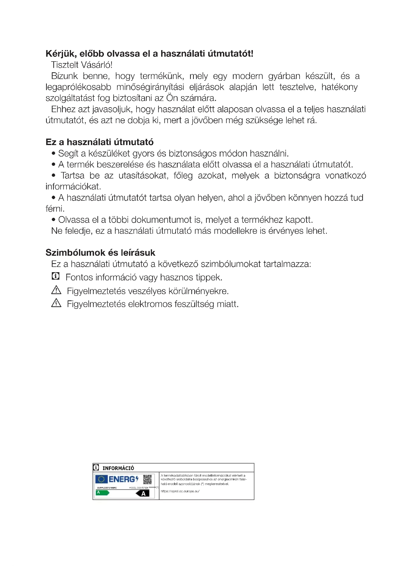 A termékadatbázisban tárolt modellinformációkat elérheti a következő weboldalra belépéssel és az energiacímkén talál-ható modell azonosítójának (*) megkeresésével.https://eprel.ec.europa.eu/