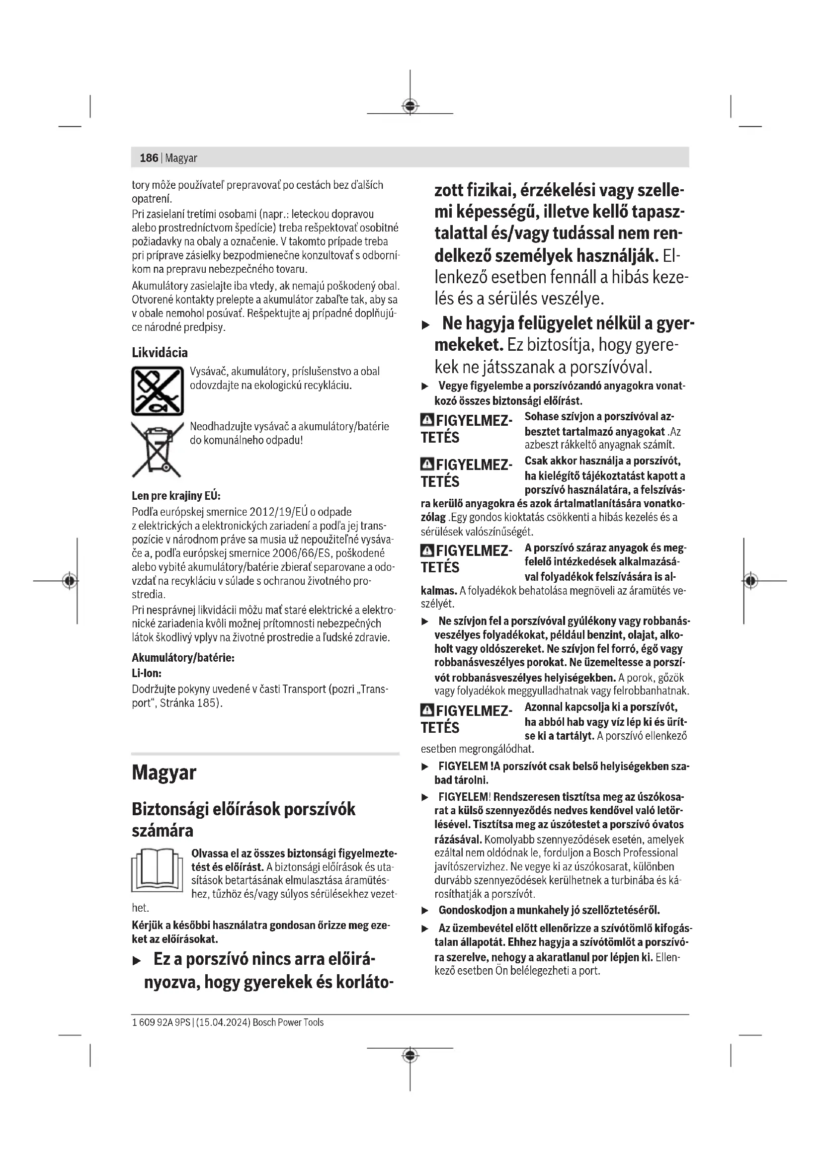 Cikkszám 3601JK20.. Feszültség V 18 Névleges felvett teljesítmény W 400 1 609 92A 9PS | (15.04.2024) Bosch Power ToolsMagyar | 189 Akkumulátoros száraz/ nedvesporszívó