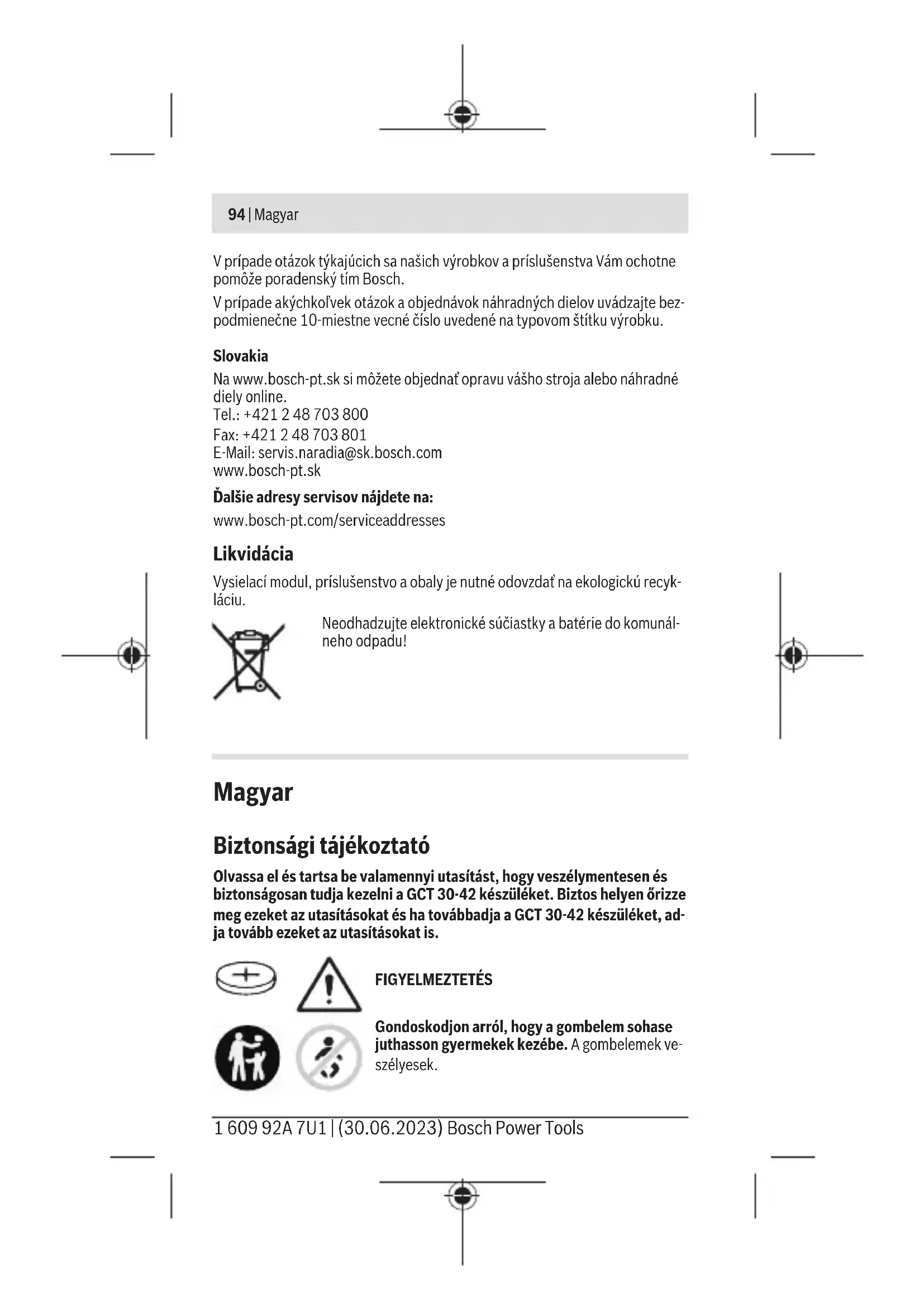 alebo – Gombíková batéria je vybitá – Znova spustite pokus opripojenie alebo – Vymeňte gombíkovú batériu Údržba aservis Údržba ačistenie Odstráňte znečistenie štetcom alebo vlhkou handričkou. Nepoužívajte žiadne čistiace prostriedky či rozpúšťadlá. Výmena gombíkovej batérie u Pozor: Gombíkovú batériu vymieňajte vždy za gombíkovú batériu rov- nakého typu. Hrozí nebezpečenstvo výbuchu. u Vybité gombíkové batérie likvidujte vsúlade spredpismi. Vybité gom- bíkové batérie sa môžu stať netesnými apoškodiť produkt alebo poraniť osoby. – Otvorte veko priehradky na batérie na zadnej strane vysielacieho modulu pomocou mince. – Opatrne vyberte gombíkovú batériu azaložte novú gombíkovú batériu. Dodržte označenie na správne založenie gombíkovej batérie. – Pomocou mince zatvorte veko priehradky na batérie. Otočte veko až na doraz, aby sa zaručilo správne uzatvorenie. Zákaznícka služba aporadenstvo ohľadom použitia Servisné stredisko Vám odpovie na otázky týkajúce sa opravy aúdržby Vášho produktu ako aj náhradných dielov. Rozkladové výkresy ainformácie onáh- radných dieloch nájdete tiež na: www.bosch-pt.com Bosch Power Tools 1 609 92A 7U1 | (30.06.2023)94 | Magyar Vprípade otázok týkajúcich sa našich výrobkov apríslušenstva Vám ochotne pomôže poradenský tím Bosch. Vprípade akýchkoľvek otázok aobjednávok náhradných dielov uvádzajte bez- podmienečne 10‑miestne vecné číslo uvedené na typovom štítku výrobku. Slovakia Na www.bosch-pt.sk si môžete objednať opravu vášho stroja alebo náhradné diely online. Tel.: +421 2 48 703 800 Fax: +421 2 48 703 801 E-Mail: servis.naradia@sk.bosch.com www.bosch-pt.sk Ďalšie adresy servisov nájdete na: www.bosch-pt.com/serviceaddresses Likvidácia Vysielací modul, príslušenstvo aobaly je nutné odovzdať na ekologickú recyk- láciu. Neodhadzujte elektronické súčiastky abatérie do komunál- neho odpadu! Magyar Biztonsági tájékoztató Olvassa el és tartsa be valamennyi utasítást, hogy veszélymentesen és biztonságosan tudja kezelni aGCT 30-42készüléket. Biztos helyen őrizze meg ezeket az utasításokat és ha továbbadja aGCT 30-42készüléket, ad- ja tovább ezeket az utasításokat is. FIGYELMEZTETÉS Gondoskodjon arról, hogy a gombelem sohase juthasson gyermekek kezébe. A gombelemek ve- szélyesek. 1 609 92A 7U1 | (30.06.2023) Bosch Power ToolsMagyar | 95 u A gombelemeket sohasem szabad lenyelni, vagy egy másik testnyílás- ba bedugni. Ha fennáll annak a gyanúja, hogy valaki lenyelt vagy egy másik testnyílásába betolt egy gombelemet, menjen azonnal orvos- hoz. Egy gombelem lenyelése 2 órán belül súlyos, vagy halálos belső sérü- lésekhez vezethet. u A gombelem kicserélése során ügyeljen a gombelem szakszerű kicse- rélésére. Robbanásveszély áll fenn. u Csak az ezen Üzemeltetési útmutatóban felsorolt gombelemeket használja. Ne használjon más gombelemeket vagy más energiaforrást. u Ne próbálja meg újra feltölteni és ne zárja rövidre a gombelemeket. A gombelem tömítetlenné válhat, felrobbanhat, kigyulladhat és személyi sé- rüléseket okozhat. u A kimerült gombelemeket az előírásoknak megfelelően kell eltávolí- tani és ártalmatlanítani. A kimerült gombelemek tömítetlenné válhatnak és így a terméket megrongálhatják vagy személyi sérüléseket okozhatnak. u Ne hevítse túl és ne dobja tűzbe a gombelemeket. A gombelem tömítet- lenné válhat, felrobbanhat, kigyulladhat és személyi sérüléseket okozhat. u Ne rongálja meg és ne szerelje szét a gombelemet. A gombelem tömí- tetlenné válhat, felrobbanhat, kigyulladhat és személyi sérüléseket okoz- hat. u Gondoskodjon arról, hogy egy megrongálódott gombelem ne érint- kezhessen vízzel. A kilépő lítium vízzel való érintkezése esetén hidrogén keletkezhet és ez tűzhöz, robbanáshoz vagy személyi sérülésekhez vezet- het. A Bluetooth® szóvédjegy és a képjelek (logók) a Bluetooth SIG, Inc. be- jegyzett védjegyei és tulajdonai. A szóvédjegynek/a képjelnek a Robert Bosch Power Tools GmbH által történő valamennyi alkalmazása a megfe- lelő licencia alatt áll. Az adómodult soha ne szerelje olyan helyre (pl. markolatfelületekre, kap- csolókra, kijelzőkre), amelyek az akkus kéziszerszám kezeléséhez szük- ségesek. A termék és a teljesítmény leírása Rendeltetésszerű használat A GCT30-42 adómodul start-stop jelet hoz létre egy porszívóhoz. Ez a jel to- vábbítható egy automatikus indítási funkcióval rendelkező Bosch Professional porszívóhoz vagy a GCA30-42 vevőmodulhoz. További információkat a Bosch GCA 30-42 + GCT 30-42 automatikus indítási rendszer és a használt porszívó kezelési útmutatójából tudhat meg. Bosch Power Tools 1 609 92A 7U1 | (30.06.2023)96 | Magyar Az ábrázolásra kerülő komponensek Az ábrázolt alkatrészek sorszámozása megfelel az ábráknak az ábrákat tartal- mazó oldalon. (1) Adómodul (2) LED-es állapotkijelző (User Interface) (3) Start/stop gomb (User Interface) (4) Gumiszalag rögzítőkampója (5) Gumiszalag Műszaki adatok Adómodul GCT 30-42 Rendelési szám 1 600 A02 GH. Üzemi hőmérséklet –20...+50 °C Tárolási hőmérséklet –20...+65 °C Méret