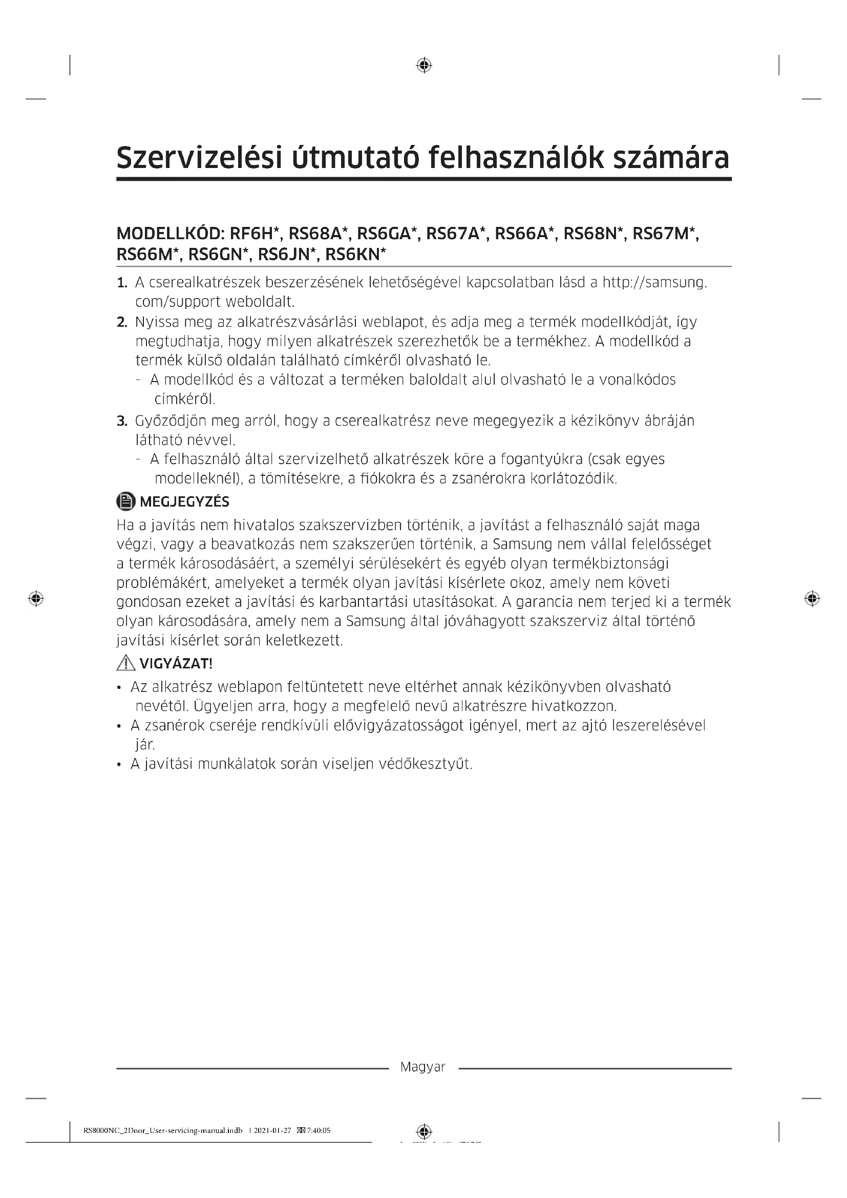 látható névvel. - A felhasználó által szervizelhető alkatrészek köre a fogantyúkra (csak egyes modelleknél), a tömítésekre, a ókokra és a zsanérokra korlátozódik. MEGJEGYZÉS Ha a javítás nem hivatalos szakszervizben történik, a javítást a felhasználó saját maga végzi, vagy a beavatkozás nem szakszerűen történik, a Samsung nem vállal felelősséget a termék károsodásáért, a személyi sérülésekért és egyéb olyan termékbiztonsági problémákért, amelyeket a termék olyan javítási kísérlete okoz, amely nem követi gondosan ezeket a javítási és karbantartási utasításokat. A garancia nem terjed ki a termék olyan károsodására, amely nem a Samsung által jóváhagyott szakszerviz által történő javítási kísérlet során keletkezett. VIGYÁZAT!