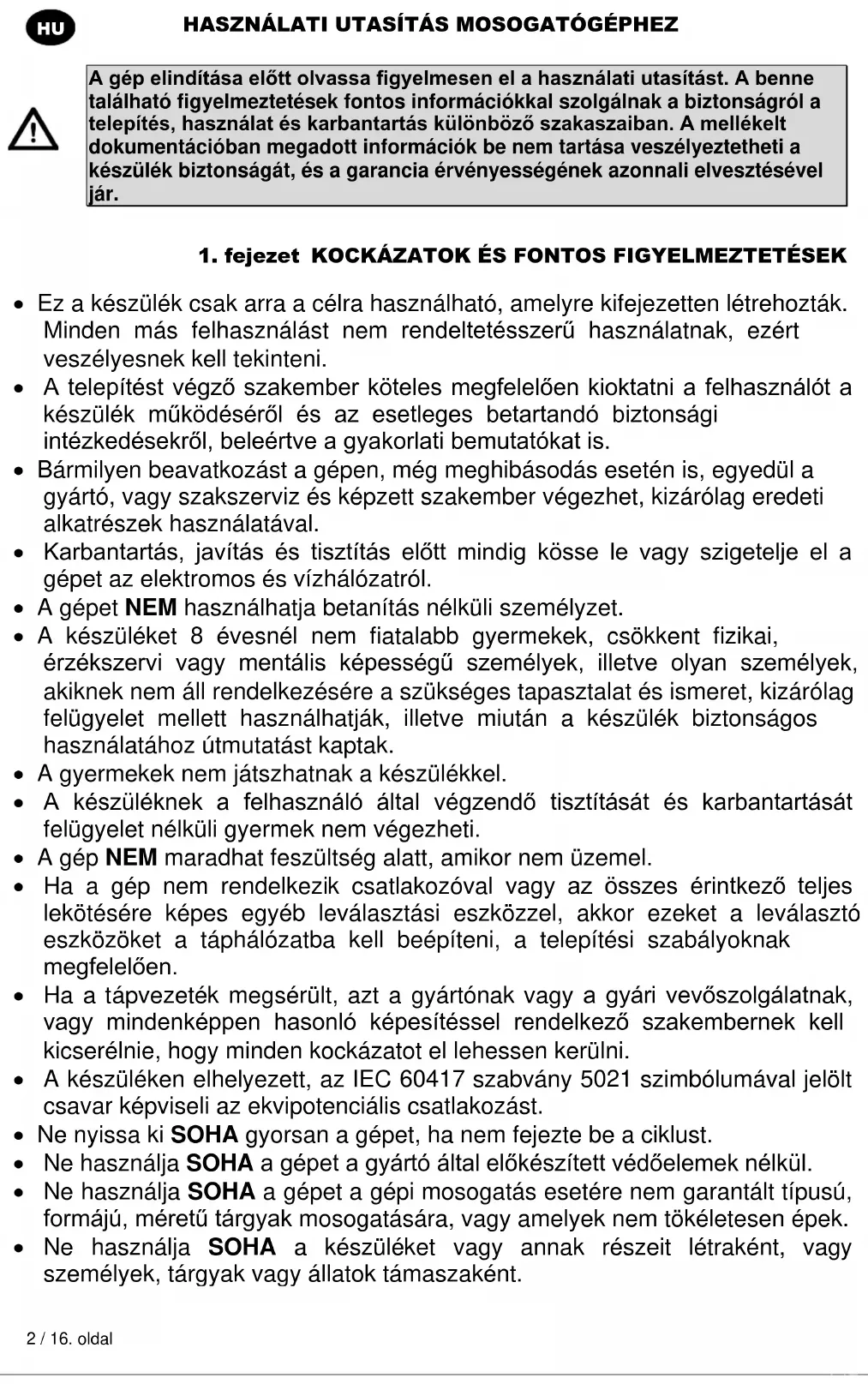 A gép elindítása előtt olvassa figyelmesen el a használati utasítást. A benne található figyelmeztetések fontos információkkal szolgálnak a biztonságról a telepítés, használat és karbantartás különböző szakaszaiban. A mellékelt dokumentációban megadott információk be nem tartása veszélyeztetheti a készülék biztonságát, és a garancia érvényességének azonnali elvesztésével jár.