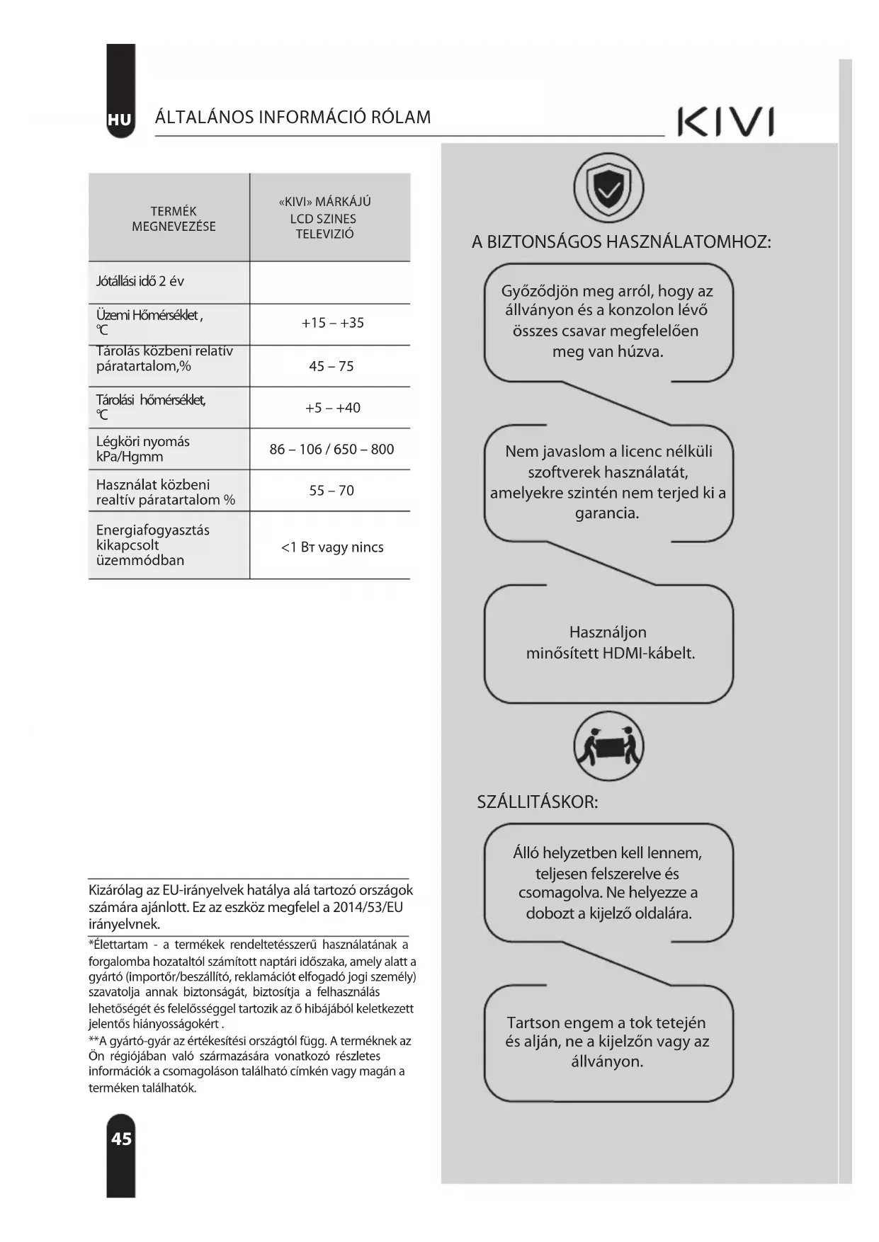 *Élettartam - a termékek rendeltetésszerű használatának a forgalomba hozataltól számított naptári időszaka, amely alatt a gyártó (importőr/beszállító, reklamációt elfogadó jogi személy) szavatolja annak biztonságát, biztosítja a felhasználás lehetőségét és felelősséggel tartozik az ő hibájából keletkezett jelentős hiányosságokért . **A gyártó-gyár az értékesítési országtól függ. A terméknek az Ön régiójában való származására vonatkozó részletes információk a csomagoláson található címkén vagy magán a terméken találhatók. Kizárólag az EU-irányelvek hatálya alá tartozó országok számára ajánlott. Ez az eszköz megfelel a 2014/53/EU irányelvnek. SZÁLLITÁSKOR: Álló helyzetben kell lennem, teljesen felszerelve és csomagolva. Ne helyezze a dobozt a kijelző oldalára. Tartson engem a tok tetején és alján, ne a kijelzőn vagy az állványon. Használjon minősített HDMI-kábelt. Nem javaslom a licenc nélküli szoftverek használatát, amelyekre szintén nem terjed ki a garancia. Győződjön meg arról, hogy az állványon és a konzolon lévő összes csavar megfelelően meg van húzva. A BIZTONSÁGOS HASZNÁLATOMHOZ: TERMÉK MEGNEVEZÉSE