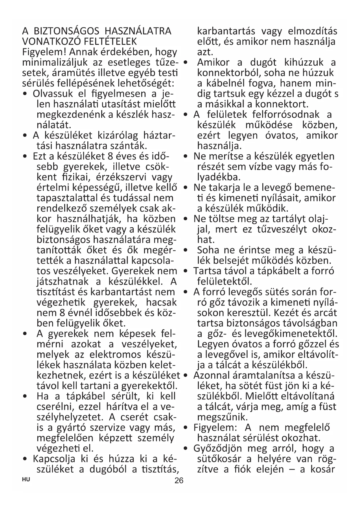 - A forró levegős sütés során for- ró gőz távozik a kimene nyílá- sokon keresztül. Kezét és arcát tartsa biztonságos távolságban a gőz- és levegőkimenetektől. Legyen óvatos a forró gőzzel és a levegővel is, amikor eltávolít- ja a tálcát a készülékből.