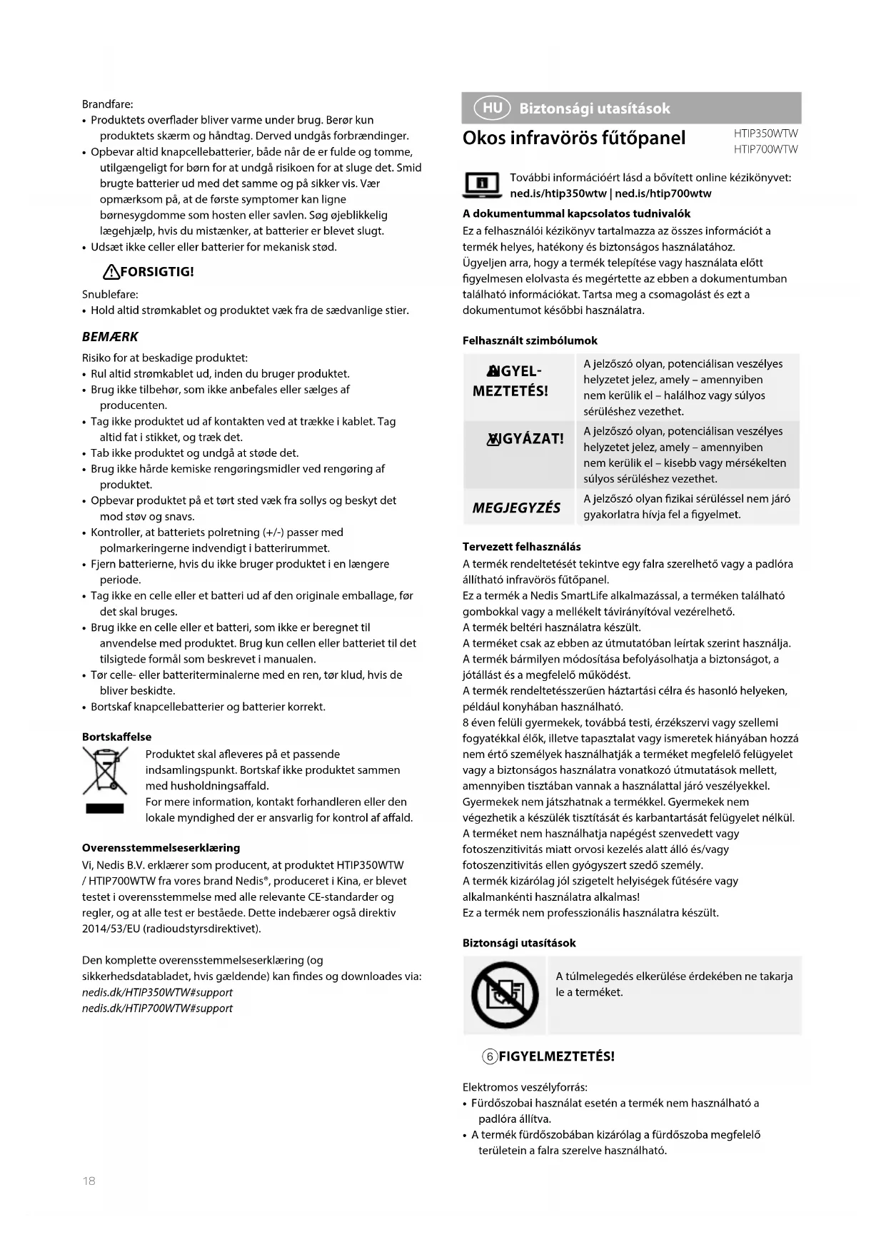 Biztonsági utasítások Okos infravörös fűtőpanel HTIP350WTW HTIP700WTWTovábbi információért lásd a bővített online kézikönyvet: ned.is/htip350wtw | ned.is/htip700wtwA dokumentummal kapcsolatos tudnivalókEz a felhasználói kézikönyv tartalmazza az összes információt a termék helyes, hatékony és biztonságos használatához.Ügyeljen arra, hogy a termék telepítése vagy használata előtt gyelmesen elolvasta és megértette az ebben a dokumentumban található információkat. Tartsa meg a csomagolást és ezt a dokumentumot későbbi használatra.Felhasznált szimbólumok 6 FIGYEL- MEZTETÉS! A jelzőszó olyan, potenciálisan veszélyes helyzetet jelez, amely – amennyiben nem kerülik el – halálhoz vagy súlyos sérüléshez vezethet. 1 VIGYÁZAT! A jelzőszó olyan, potenciálisan veszélyes helyzetet jelez, amely – amennyiben nem kerülik el – kisebb vagy mérsékelten súlyos sérüléshez vezethet. MEGJEGYZÉS A jelzőszó olyan zikai sérüléssel nem járó gyakorlatra hívja fel a gyelmet.Tervezett felhasználásA termék rendeltetését tekintve egy falra szerelhető vagy a padlóra állítható infravörös fűtőpanel.Ez a termék a Nedis SmartLife alkalmazással, a terméken található gombokkal vagy a mellékelt távirányítóval vezérelhető.A termék beltéri használatra készült.A terméket csak az ebben az útmutatóban leírtak szerint használja.A termék bármilyen módosítása befolyásolhatja a biztonságot, a jótállást és a megfelelő működést.A termék rendeltetésszerűen háztartási célra és hasonló helyeken, például konyhában használható.8 éven felüli gyermekek, továbbá testi, érzékszervi vagy szellemi fogyatékkal élők, illetve tapasztalat vagy ismeretek hiányában hozzá nem értő személyek használhatják a terméket megfelelő felügyelet vagy a biztonságos használatra vonatkozó útmutatások mellett, amennyiben tisztában vannak a használattal járó veszélyekkel. Gyermekek nem játszhatnak a termékkel. Gyermekek nem végezhetik a készülék tisztítását és karbantartását felügyelet nélkül.A terméket nem használhatja napégést szenvedett vagy fotoszenzitivitás miatt orvosi kezelés alatt álló és/vagy fotoszenzitivitás ellen gyógyszert szedő személy.A termék kizárólag jól szigetelt helyiségek fűtésére vagy alkalmankénti használatra alkalmas!Ez a termék nem professzionális használatra készült.Biztonsági utasításokA túlmelegedés elkerülése érdekében ne takarja le a terméket. 6 FIGYELMEZTETÉS! Elektromos veszélyforrás:• Fürdőszobai használat esetén a termék nem használható a padlóra állítva.• A termék fürdőszobában kizárólag a fürdőszoba megfelelő területein a falra szerelve használható.Brandfare:• Produktets overader bliver varme under brug. Berør kun produktets skærm og håndtag. Derved undgås forbrændinger.• Opbevar altid knapcellebatterier, både når de er fulde og tomme, utilgængeligt for børn for at undgå risikoen for at sluge det. Smid brugte batterier ud med det samme og på sikker vis. Vær opmærksom på, at de første symptomer kan ligne børnesygdomme som hosten eller savlen. Søg øjeblikkelig lægehjælp, hvis du mistænker, at batterier er blevet slugt.• Udsæt ikke celler eller batterier for mekanisk stød. 1 FORSIGTIG! Snublefare:• Hold altid strømkablet og produktet væk fra de sædvanlige stier. BEMÆRK Risiko for at beskadige produktet:• Rul altid strømkablet ud, inden du bruger produktet.• Brug ikke tilbehør, som ikke anbefales eller sælges af producenten.• Tag ikke produktet ud af kontakten ved at trække i kablet. Tag altid fat i stikket, og træk det.• Tab ikke produktet og undgå at støde det.• Brug ikke hårde kemiske rengøringsmidler ved rengøring af produktet.• Opbevar produktet på et tørt sted væk fra sollys og beskyt det mod støv og snavs.• Kontroller, at batteriets polretning (+/-) passer med polmarkeringerne indvendigt i batterirummet.• Fjern batterierne, hvis du ikke bruger produktet i en længere periode.• Tag ikke en celle eller et batteri ud af den originale emballage, før det skal bruges.• Brug ikke en celle eller et batteri, som ikke er beregnet til anvendelse med produktet. Brug kun cellen eller batteriet til det tilsigtede formål som beskrevet i manualen.• Tør celle- eller batteriterminalerne med en ren, tør klud, hvis de bliver beskidte.• Bortskaf knapcellebatterier og batterier korrekt.BortskaelseProduktet skal aeveres på et passende indsamlingspunkt. Bortskaf ikke produktet sammen med husholdningsaald.For mere information, kontakt forhandleren eller den lokale myndighed der er ansvarlig for kontrol af aald.OverensstemmelseserklæringVi, Nedis B.V. erklærer som producent, at produktet HTIP350WTW / HTIP700WTW fra vores brand Nedis®, produceret i Kina, er blevet testet i overensstemmelse med alle relevante CE-standarder og regler, og at alle test er beståede. Dette indebærer også direktiv 2014/53/EU (radioudstyrsdirektivet).Den komplette overensstemmelseserklæring (og sikkerhedsdatabladet, hvis gældende) kan ndes og downloades via:nedis.dk/HTIP350WTW#supportnedis.dk/HTIP700WTW#supportNedis® SmartLife | Safety instructions 19 1 VIGYÁZAT! Botlásveszély: