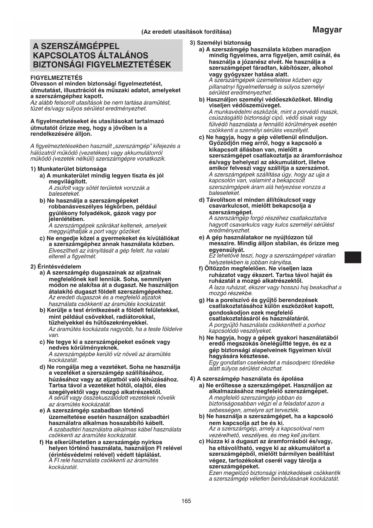 FIGYELMEZTETÉS Olvasson el minden biztonsági figyelmeztetést, útmutatást, illusztrációt és műszaki adatot, amelyeket a szerszámgéphez kapott. Az alább felsorolt utasítások be nem tartása áramütést, tüzet és/vagy súlyos sérülést eredményezhet. A figyelmeztetéseket és utasításokat tartalmazó útmutatót őrizze meg, hogy a jövőben is a rendelkezésére álljon. A figyelmeztetésekben használt „szerszámgép” kifejezés a hálózatról működő (vezetékes) vagy akkumulátorról működő (vezeték nélküli) szerszámgépre vonatkozik.