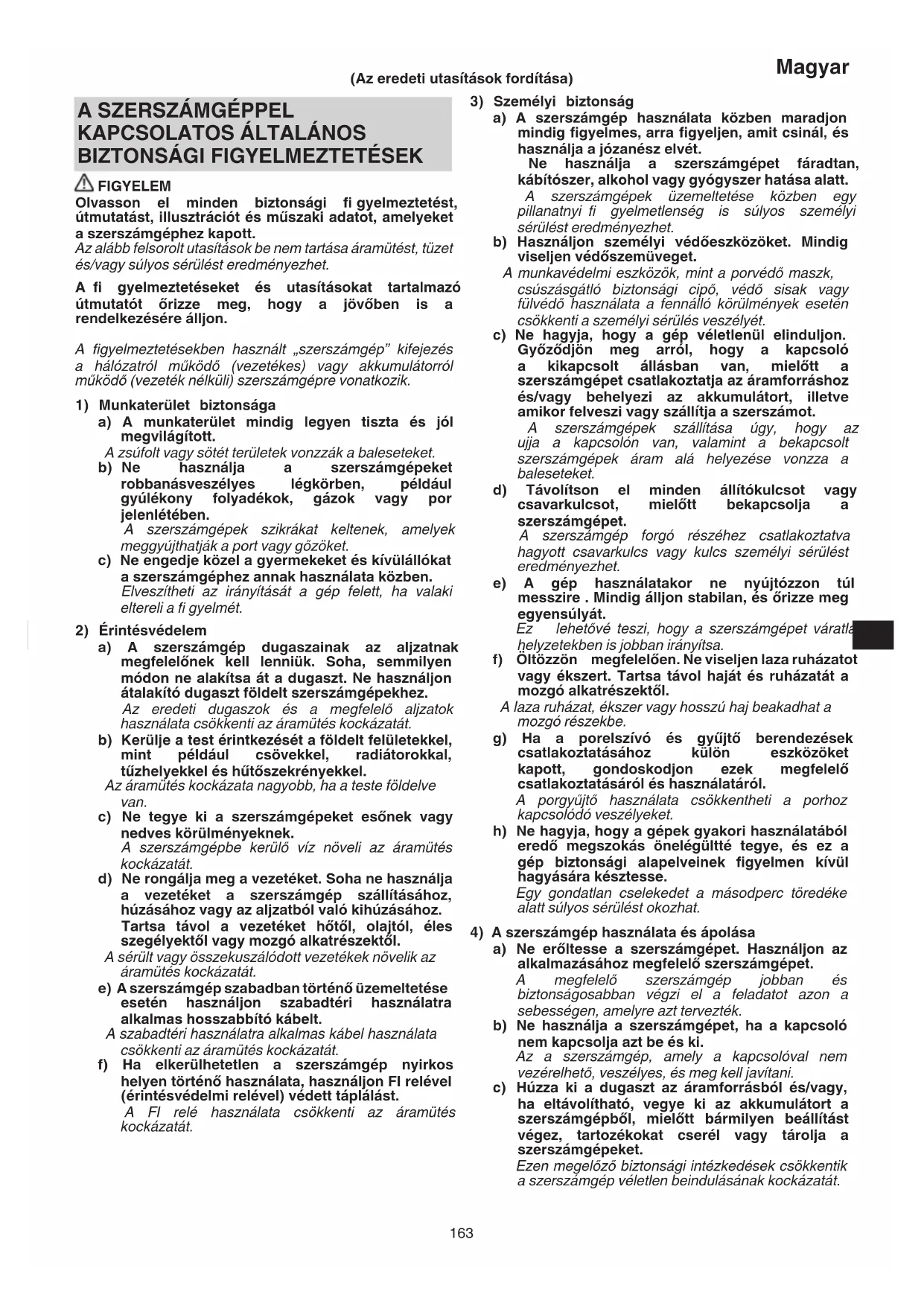 FIGYELEM Olvasson el minden biztonsági fi gyelmeztetést, útmutatást, illusztrációt és műszaki adatot, amelyeket a szerszámgéphez kapott. Az alább felsorolt utasítások be nem tartása áramütést, tüzet és/vagy súlyos sérülést eredményezhet. A fi gyelmeztetéseket és utasításokat tartalmazó útmutatót őrizze meg, hogy a jövőben is a rendelkezésére álljon. A fi gyelmeztetésekben használt „szerszámgép” kifejezés a hálózatról működő (vezetékes) vagy akkumulátorról működő (vezeték nélküli) szerszámgépre vonatkozik.