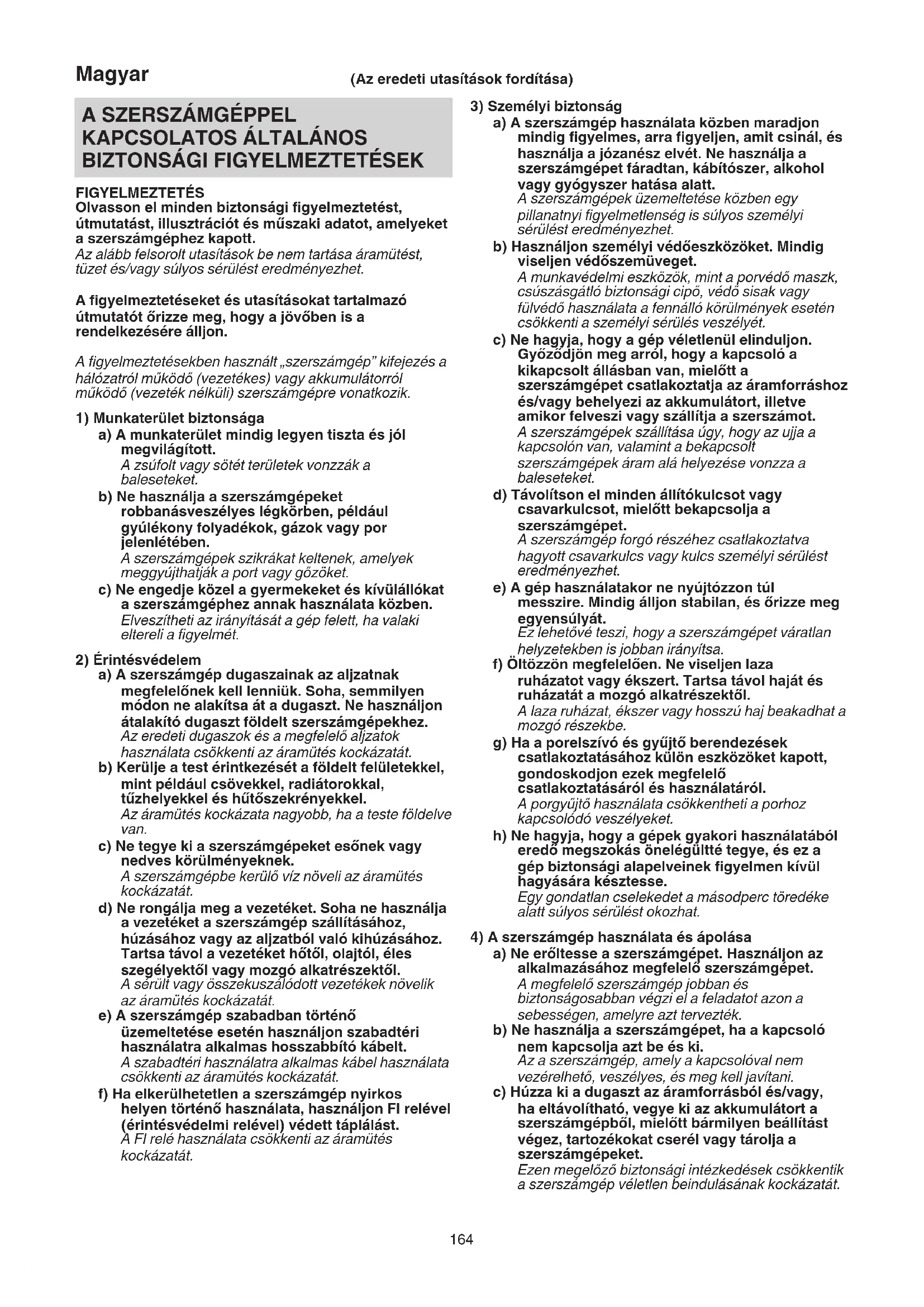 FIGYELMEZTETÉS Olvasson el minden biztonsági figyelmeztetést, útmutatást, illusztrációt és műszaki adatot, amelyeket a szerszámgéphez kapott. Az alább felsorolt utasítások be nem tartása áramütést, tüzet és/vagy súlyos sérülést eredményezhet. A figyelmeztetéseket és utasításokat tartalmazó útmutatót őrizze meg, hogy a jövőben is a rendelkezésére álljon. A figyelmeztetésekben használt „szerszámgép” kifejezés a hálózatról működő (vezetékes) vagy akkumulátorról működő (vezeték nélküli) szerszámgépre vonatkozik.