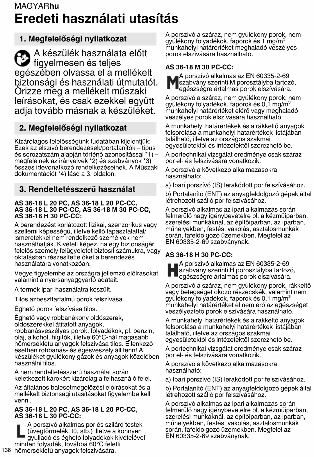 Eredeti használati utasítás A készülék használata előtt figyelmesen és teljes egészében olvassa el a mellékelt biztonsági és használati útmutatót. Őrizze meg a mellékelt műszaki leírásokat, és csak ezekkel együtt adja tovább másnak a készüléket. Kizárólagos felelősségünk tudatában kijelentjük: Ezek az elszívó berendezések/portalanítók – típus és sorozatszám alapján történő azonosítással *1) – megfelelnek az irányelvek *2) és szabványok *3) összes idevonatkozó rendelkezéseinek. A Műszaki dokumentációt *4) lásd a 3. oldalon. AS 36-18 L 20 PC, AS 36-18 L 20 PC-CC, AS 36-18 L 30 PC-CC, AS 36-18 M 30 PC-CC, AS 36-18 H 30 PC-CC: A berendezést korlátozott fizikai, szenzorikus vagy szellemi képességű, illetve kellő tapasztalattal/ ismeretekkel nem rendelkező személyek nem használhatják. Kivételt képez, ha egy biztonságért felelős személy felügyeletet biztosít számukra, vagy oktatásban részesítette őket a berendezés használatára vonatkozóan. Vegye figyelembe az országra jellemző előírásokat, valamint a nyersanyaggyártó adatait. A termék ipari használatra készült. Tilos azbeszttartalmú porok felszívása. Éghető porok felszívása tilos. Éghető vagy robbanékony oldószerek, oldószerekkel átitatott anyagok, robbanásveszélyes porok, folyadékok, pl. benzin, olaj, alkohol, hígítók, illetve 60°C-nál magasabb hőmérsékletű anyagok felszívása tilos. Ellenkező esetben robbanás- és égésveszély áll fenn! A készüléket gyúlékony gázok és anyagok közelében használni tilos. A nem rendeltetésszerű használat során keletkezett károkért kizárólag a felhasználó felel. Az általános balesetmegelőzési előírásokat és a mellékelt biztonsági utasításokat figyelembe kell venni. AS 36-18 L 20 PC, AS 36-18 L 20 PC-CC, AS 36-18 L 30 PC-CC: A porszívó alkalmas por és szilárd testek (üvegtörmelék, tű, stb.) illetve a könnyen gyulladó és éghető folyadékok kivételével minden folyadék, továbbá 60°C feletti hőmérsékletű anyagok felszívására. A porszívó a száraz, nem gyúlékony porok, nem gyúlékony folyadékok, faporok és 1 mg/m³ munkahelyi határértéket meghaladó veszélyes porok elszívására használható. AS 36-18 M 30 PC-CC: A porszívó alkalmas az EN 60335-2-69 szabvány szerinti M porosztályba tartozó, egészségre ártalmas porok elszívására. A porszívó a száraz, nem gyúlékony porok, nem gyúlékony folyadékok, faporok és 0,1 mg/m³ munkahelyi határértéket elérő vagy meghaladó veszélyes porok elszívására használható. A munkahelyi határértékek és a rákkeltő anyagok felsorolása a munkahelyi határértékek listájában található, illetve az országos szakmai egyesületektől és intézetektől szerezhető be. A portechnikai vizsgálat eredménye csak száraz por el- és felszívására vonatkozik. A porszívó a következő alkalmazásokra használható: a) Ipari porszívó (IS) lerakódott por felszívásához. b) Portalanító (ENT) az anyagfeldolgozó gépek által létrehozott szálló por felszívásához. A porszívó alkalmas az ipari alkalmazás során felmerülő nagy igénybevételre pl. a kézműiparban, szerelési munkáknál, az építőiparban, az iparban, műhelyekben, festés, vakolás, asztalosmunkák során, fafeldolgozó üzemekben. Megfelel az EN 60335-2-69 szabványnak. AS 36-18 H 30 PC-CC: A porszívó alkalmas az EN 60335-2-69 szabvány szerinti H porosztályba tartozó, egészségre ártalmas porok elszívására. A porszívó a száraz, nem gyúlékony porok, rákkeltő vagy betegséget okozó részecskék, valamint nem gyúlékony folyadékok, faporok és 0,1 mg/m³ munkahelyi határértéket el nem érő az egészséget veszélyeztető porok elszívására használható. A munkahelyi határértékek és a rákkeltő anyagok felsorolása a munkahelyi határértékek listájában található, illetve az országos szakmai egyesületektől és intézetektől szerezhető be. A portechnikai vizsgálat eredménye csak száraz por el- és felszívására vonatkozik. A porszívó a következő alkalmazásokra használható: a) Ipari porszívó (IS) lerakódott por felszívásához. b) Portalanító (ENT) az anyagfeldolgozó gépek által létrehozott szálló por felszívásához. A porszívó alkalmas az ipari alkalmazás során felmerülő nagy igénybevételre pl. a kézműiparban, szerelési munkáknál, az építőiparban, az iparban, műhelyekben, festés, vakolás, asztalosmunkák során, fafeldolgozó üzemekben. Megfelel az EN 60335-2-69 szabványnak.