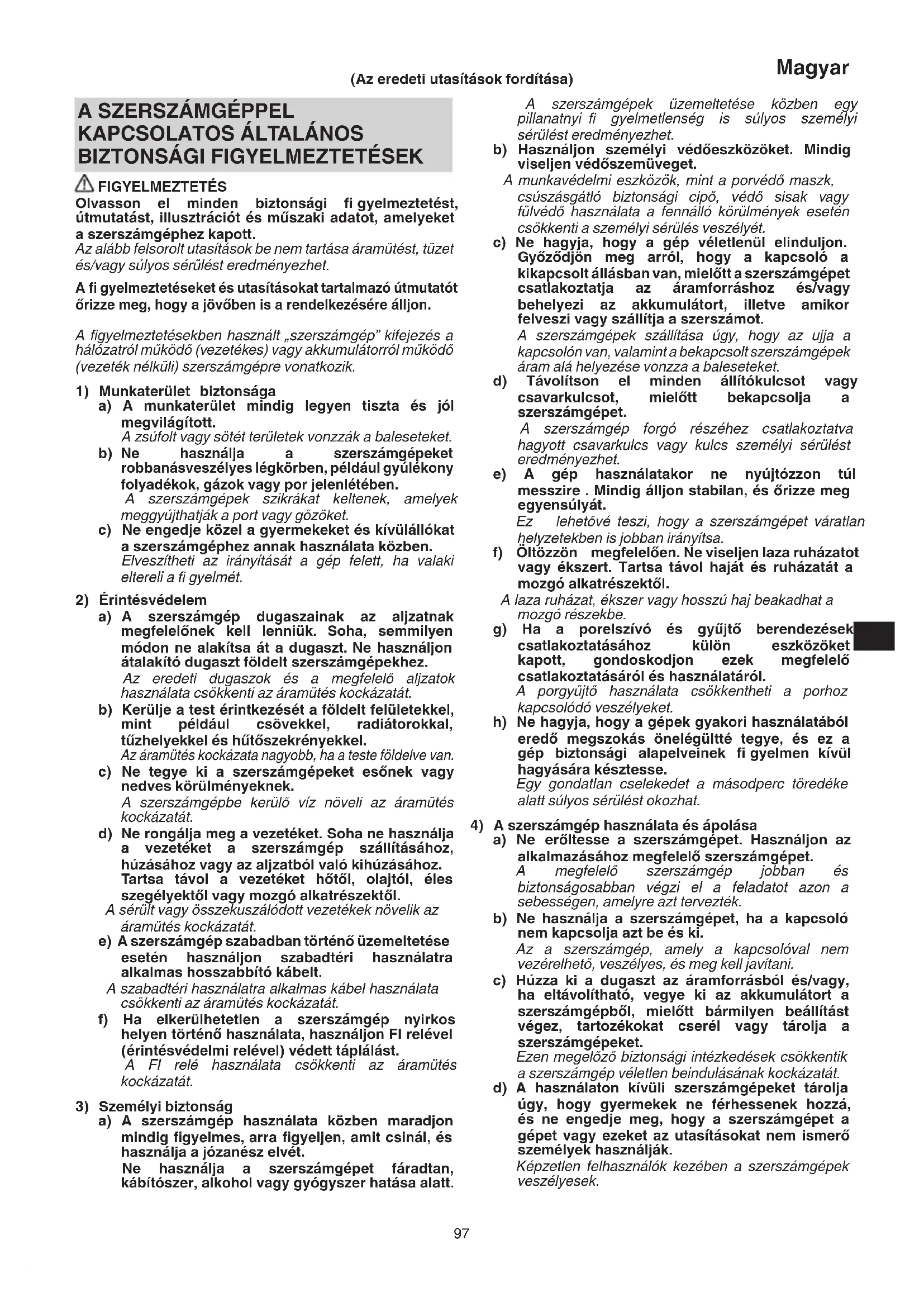 FIGYELMEZTETÉS Olvasson el minden biztonsági fi gyelmeztetést, útmutatást, illusztrációt és műszaki adatot, amelyeket a szerszámgéphez kapott. Az alább felsorolt utasítások be nem tartása áramütést, tüzet és/vagy súlyos sérülést eredményezhet. A fi gyelmeztetéseket és utasításokat tartalmazó útmutatót őrizze meg, hogy a jövőben is a rendelkezésére álljon. A fi gyelmeztetésekben használt „szerszámgép” kifejezés a hálózatról működő (vezetékes) vagy akkumulátorról működő (vezeték nélküli) szerszámgépre vonatkozik.