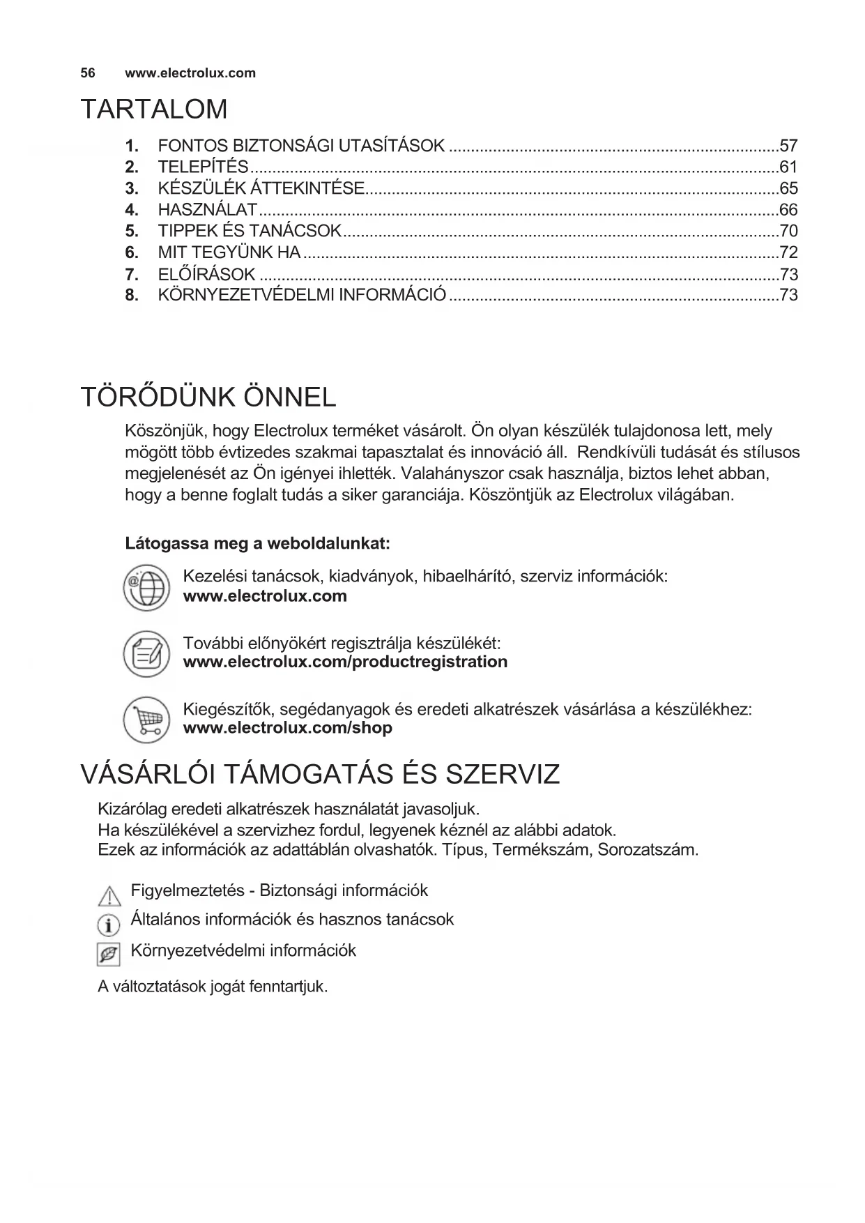 plateau tournant ø 270 mm, verre poids env. 15,7 kg ELECTROLUX_French_25LGRILL_SBI_BASE_AJ26UICTO_Layout 1 26/04/2022 11:34 Page 5556 www.electrolux.com tartaloM tördünk önnel köszönjük, hogy electrolux terméket vásárolt. ön olyan készülék tulajdonosa lett, mely mögött több évtizedes szakmai tapasztalat és innováció áll. rendkívüli tudását és stílusos megjelenését az ön igényei ihlették. valahányszor csak használja, biztos lehet abban, hogy a benne foglalt tudás a siker garanciája. köszöntjük az electrolux világában. Látogassa meg a weboldalunkat: vásárlói táMogatás és szerviz kizárólag eredeti alkatrészek használatát javasoljuk. Ha készülékével a szervizhez fordul, legyenek kéznél az alábbi adatok. ezek az információk az adattáblán olvashatók. típus, termékszám, sorozatszám. a változtatások jogát fenntartjuk. Figyelmeztetés - biztonsági információk általános információk és hasznos tanácsok környezetvédelmi információk kezelési tanácsok, kiadványok, hibaelhárító, szerviz információk: www.electrolux.com további elnyökért regisztrálja készülékét: www.electrolux.com/productregistration kiegészítk, segédanyagok és eredeti alkatrészek vásárlása a készülékhez: www.electrolux.com/shop