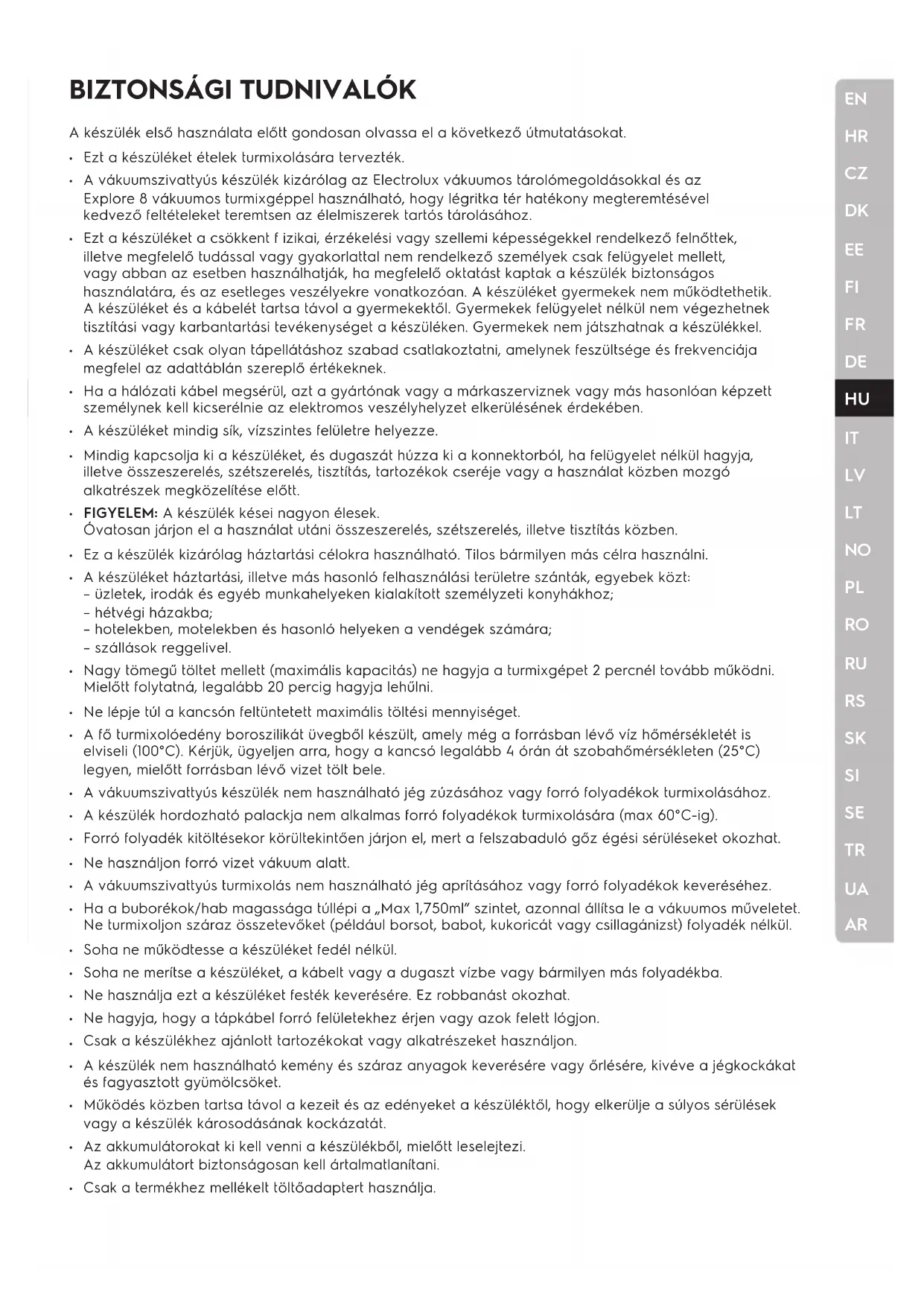 Ezt a készüléket ételek turmixolására tervezték. A vákuumszivattyús készülék kizárólag az Electrolux vákuumos tárolómegoldásokkal és az Explore 8 vákuumos turmixgéppel használható, hogy légritka tér hatékony megteremtésével kedvező feltételeket teremtsen az élelmiszerek tartós tárolásához. Ezt a készüléket a csökkent f izikai, érzékelési vagy szellemi képességekkel rendelkező felnőttek, illetve megfelelő tudással vagy gyakorlattal nem rendelkező személyek csak felügyelet mellett, vagy abban az esetben használhatják, ha megfelelő oktatást kaptak a készülék biztonságos használatára, és az esetleges veszélyekre vonatkozóan. A készüléket gyermekek nem működtethetik. A készüléket és a kábelét tartsa távol a gyermekektől. Gyermekek felügyelet nélkül nem végezhetnek tisztítási vagy karbantartási tevékenységet a készüléken. Gyermekek nem játszhatnak a készülékkel. A készüléket csak olyan tápellátáshoz szabad csatlakoztatni, amelynek feszültsége és frekvenciája megfelel az adattáblán szereplő értékeknek. Ha a hálózati kábel megsérül, azt a gyártónak vagy a márkaszerviznek vagy más hasonlóan képzett személynek kell kicserélnie az elektromos veszélyhelyzet elkerülésének érdekében. A készüléket mindig sík, vízszintes felületre helyezze. Mindig kapcsolja ki a készüléket, és dugaszát húzza ki a konnektorból, ha felügyelet nélkül hagyja, illetve összeszerelés, szétszerelés, tisztítás, tartozékok cseréje vagy a használat közben mozgó alkatrészek megközelítése előtt. FIGYELEM: A készülék kései nagyon élesek. Óvatosan járjon el a használat utáni összeszerelés, szétszerelés, illetve tisztítás közben. Ez a készülék kizárólag háztartási célokra használható. Tilos bármilyen más célra használni. A készüléket háztartási, illetve más hasonló felhasználási területre szánták, egyebek közt: – üzletek, irodák és egyéb munkahelyeken kialakított személyzeti konyhákhoz; – hétvégi házakba; – hotelekben, motelekben és hasonló helyeken a vendégek számára; – szállások reggelivel. Nagy tömegű töltet mellett (maximális kapacitás) ne hagyja a turmixgépet 2 percnél tovább működni. Mielőtt folytatná, legalább 20 percig hagyja lehűlni. Ne lépje túl a kancsón feltüntetett maximális töltési mennyiséget. A fő turmixolóedény boroszilikát üvegből készült, amely még a forrásban lévő víz hőmérsékletét is elviseli (100°C). Kérjük, ügyeljen arra, hogy a kancsó legalább 4 órán át szobahőmérsékleten (25°C) legyen, mielőtt forrásban lévő vizet tölt bele. A vákuumszivattyús készülék nem használható jég zúzásához vagy forró folyadékok turmixolásához. A készülék hordozható palackja nem alkalmas forró folyadékok turmixolására (max 60°C-ig). Forró folyadék kitöltésekor körültekintően járjon el, mert a felszabaduló gőz égési sérüléseket okozhat. Ne használjon forró vizet vákuum alatt. A vákuumszivattyús turmixolás nem használható jég aprításához vagy forró folyadékok keveréséhez. Ha a buborékok/hab magassága túllépi a „Max 1,750ml” szintet, azonnal állítsa le a vákuumos műveletet. Ne turmixoljon száraz összetevőket (például borsot, babot, kukoricát vagy csillagánizst) folyadék nélkül. Soha ne működtesse a készüléket fedél nélkül. Soha ne merítse a készüléket, a kábelt vagy a dugaszt vízbe vagy bármilyen más folyadékba. Ne használja ezt a készüléket festék keverésére. Ez robbanást okozhat. Ne hagyja, hogy a tápkábel forró felületekhez érjen vagy azok felett lógjon. Csak a készülékhez ajánlott tartozékokat vagy alkatrészeket használjon. A készülék nem használható kemény és száraz anyagok keverésére vagy őrlésére, kivéve a jégkockákat és fagyasztott gyümölcsöket. Működés közben tartsa távol a kezeit és az edényeket a készüléktől, hogy elkerülje a súlyos sérülések vagy a készülék károsodásának kockázatát. Az akkumulátorokat ki kell venni a készülékből, mielőtt leselejtezi. Az akkumulátort biztonságosan kell ártalmatlanítani. Csak a termékhez mellékelt töltőadaptert használja.EN
