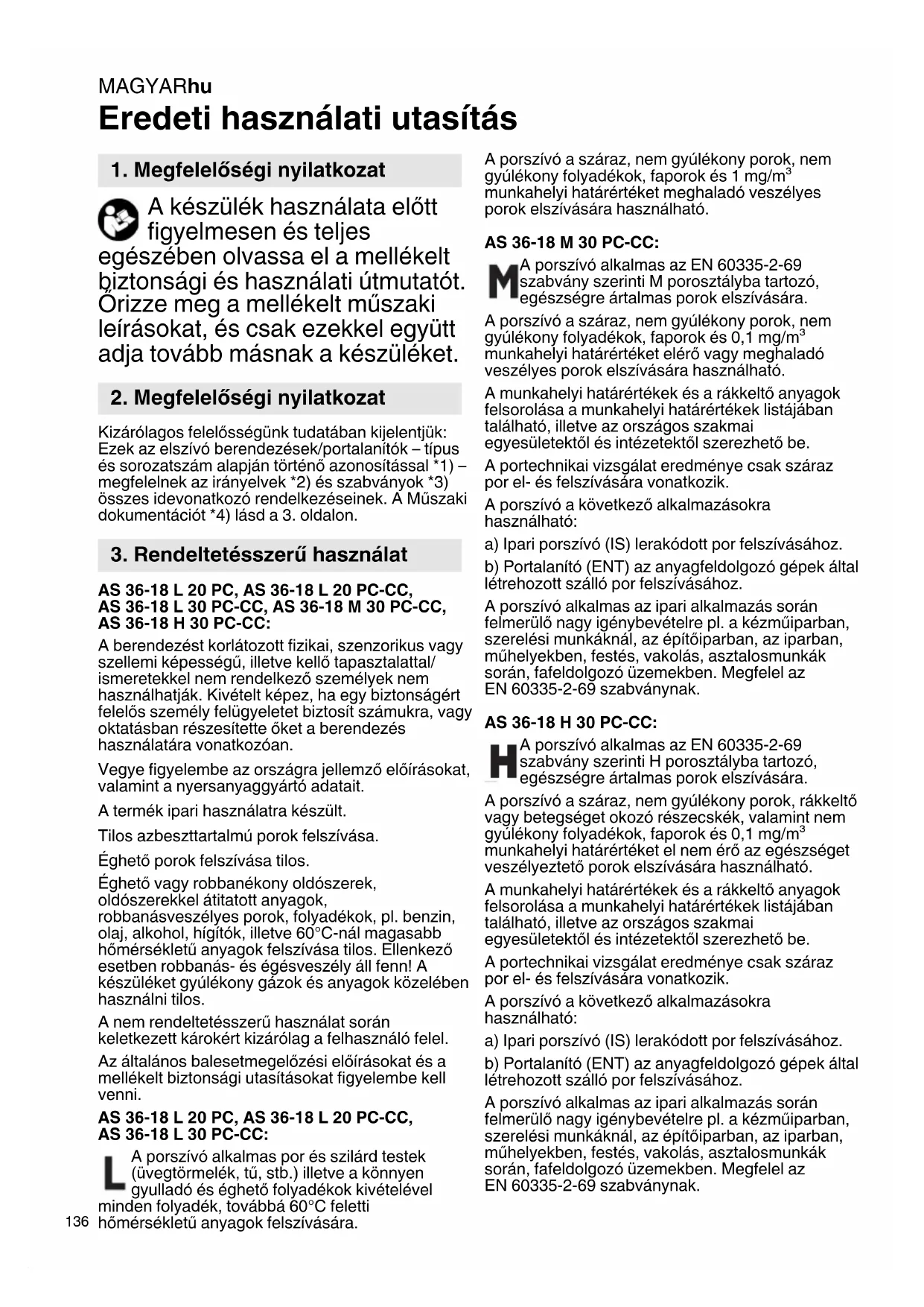 Eredeti használati utasítás A készülék használata előtt figyelmesen és teljes egészében olvassa el a mellékelt biztonsági és használati útmutatót. Őrizze meg a mellékelt műszaki leírásokat, és csak ezekkel együtt adja tovább másnak a készüléket. Kizárólagos felelősségünk tudatában kijelentjük: Ezek az elszívó berendezések/portalanítók – típus és sorozatszám alapján történő azonosítással *1) – megfelelnek az irányelvek *2) és szabványok *3) összes idevonatkozó rendelkezéseinek. A Műszaki dokumentációt *4) lásd a 3. oldalon. AS 36-18 L 20 PC, AS 36-18 L 20 PC-CC, AS 36-18 L 30 PC-CC, AS 36-18 M 30 PC-CC, AS 36-18 H 30 PC-CC: A berendezést korlátozott fizikai, szenzorikus vagy szellemi képességű, illetve kellő tapasztalattal/ ismeretekkel nem rendelkező személyek nem használhatják. Kivételt képez, ha egy biztonságért felelős személy felügyeletet biztosít számukra, vagy oktatásban részesítette őket a berendezés használatára vonatkozóan. Vegye figyelembe az országra jellemző előírásokat, valamint a nyersanyaggyártó adatait. A termék ipari használatra készült. Tilos azbeszttartalmú porok felszívása. Éghető porok felszívása tilos. Éghető vagy robbanékony oldószerek, oldószerekkel átitatott anyagok, robbanásveszélyes porok, folyadékok, pl. benzin, olaj, alkohol, hígítók, illetve 60°C-nál magasabb hőmérsékletű anyagok felszívása tilos. Ellenkező esetben robbanás- és égésveszély áll fenn! A készüléket gyúlékony gázok és anyagok közelében használni tilos. A nem rendeltetésszerű használat során keletkezett károkért kizárólag a felhasználó felel. Az általános balesetmegelőzési előírásokat és a mellékelt biztonsági utasításokat figyelembe kell venni. AS 36-18 L 20 PC, AS 36-18 L 20 PC-CC, AS 36-18 L 30 PC-CC: A porszívó alkalmas por és szilárd testek (üvegtörmelék, tű, stb.) illetve a könnyen gyulladó és éghető folyadékok kivételével minden folyadék, továbbá 60°C feletti hőmérsékletű anyagok felszívására. A porszívó a száraz, nem gyúlékony porok, nem gyúlékony folyadékok, faporok és 1 mg/m³ munkahelyi határértéket meghaladó veszélyes porok elszívására használható. AS 36-18 M 30 PC-CC: A porszívó alkalmas az EN 60335-2-69 szabvány szerinti M porosztályba tartozó, egészségre ártalmas porok elszívására. A porszívó a száraz, nem gyúlékony porok, nem gyúlékony folyadékok, faporok és 0,1 mg/m³ munkahelyi határértéket elérő vagy meghaladó veszélyes porok elszívására használható. A munkahelyi határértékek és a rákkeltő anyagok felsorolása a munkahelyi határértékek listájában található, illetve az országos szakmai egyesületektől és intézetektől szerezhető be. A portechnikai vizsgálat eredménye csak száraz por el- és felszívására vonatkozik. A porszívó a következő alkalmazásokra használható: a) Ipari porszívó (IS) lerakódott por felszívásához. b) Portalanító (ENT) az anyagfeldolgozó gépek által létrehozott szálló por felszívásához. A porszívó alkalmas az ipari alkalmazás során felmerülő nagy igénybevételre pl. a kézműiparban, szerelési munkáknál, az építőiparban, az iparban, műhelyekben, festés, vakolás, asztalosmunkák során, fafeldolgozó üzemekben. Megfelel az EN 60335-2-69 szabványnak. AS 36-18 H 30 PC-CC: A porszívó alkalmas az EN 60335-2-69 szabvány szerinti H porosztályba tartozó, egészségre ártalmas porok elszívására. A porszívó a száraz, nem gyúlékony porok, rákkeltő vagy betegséget okozó részecskék, valamint nem gyúlékony folyadékok, faporok és 0,1 mg/m³ munkahelyi határértéket el nem érő az egészséget veszélyeztető porok elszívására használható. A munkahelyi határértékek és a rákkeltő anyagok felsorolása a munkahelyi határértékek listájában található, illetve az országos szakmai egyesületektől és intézetektől szerezhető be. A portechnikai vizsgálat eredménye csak száraz por el- és felszívására vonatkozik. A porszívó a következő alkalmazásokra használható: a) Ipari porszívó (IS) lerakódott por felszívásához. b) Portalanító (ENT) az anyagfeldolgozó gépek által létrehozott szálló por felszívásához. A porszívó alkalmas az ipari alkalmazás során felmerülő nagy igénybevételre pl. a kézműiparban, szerelési munkáknál, az építőiparban, az iparban, műhelyekben, festés, vakolás, asztalosmunkák során, fafeldolgozó üzemekben. Megfelel az EN 60335-2-69 szabványnak.