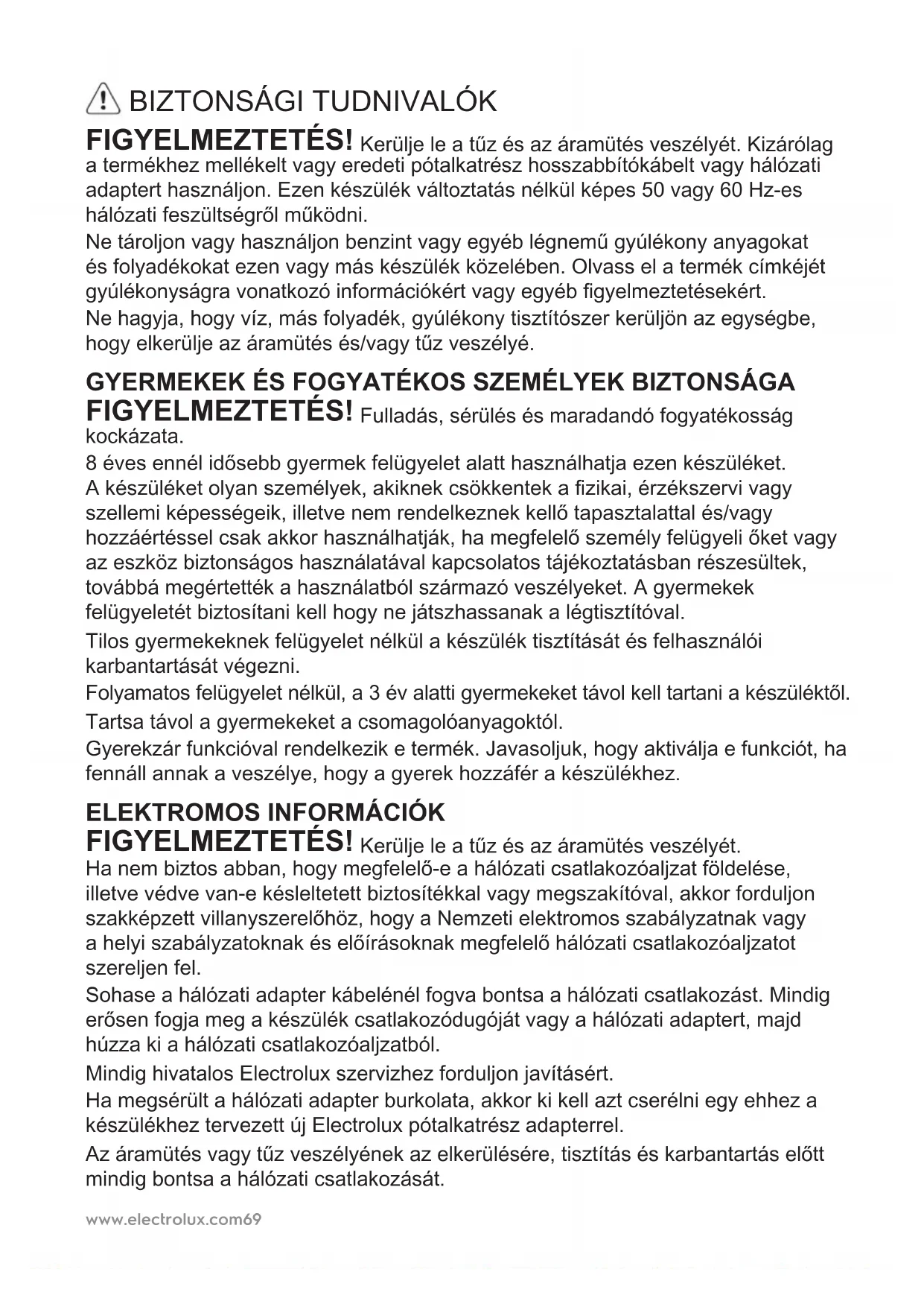 FIGYELMEZTETÉS! Kerülje le a tűz és az áramütés veszélyét. Ha nem biztos abban, hogy megfelelő-e a hálózati csatlakozóaljzat földelése, illetve védve van-e késleltetett biztosítékkal vagy megszakítóval, akkor forduljon szakképzett villanyszerelőhöz, hogy a Nemzeti elektromos szabályzatnak vagy a helyi szabályzatoknak és előírásoknak megfelelő hálózati csatlakozóaljzatot szereljen fel. Sohase a hálózati adapter kábelénél fogva bontsa a hálózati csatlakozást. Mindig erősen fogja meg a készülék csatlakozódugóját vagy a hálózati adaptert, majd húzza ki a hálózati csatlakozóaljzatból. Mindig hivatalos Electrolux szervizhez forduljon javításért. Ha megsérült a hálózati adapter burkolata, akkor ki kell azt cserélni egy ehhez a készülékhez tervezett új Electrolux pótalkatrész adapterrel. Az áramütés vagy tűz veszélyének az elkerülésére, tisztítás és karbantartás előtt mindig bontsa a hálózati csatlakozását.www.electrolux.com70