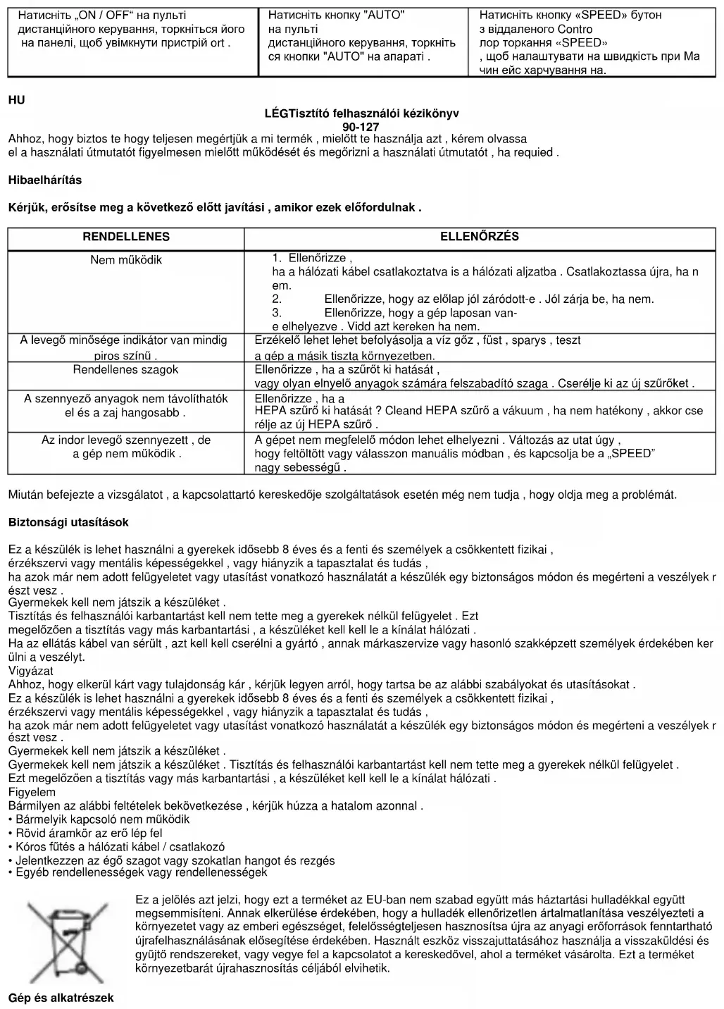 LÉGTisztító felhasználói kézikönyv 90-127 Ahhoz, hogy biztos te hogy teljesen megértjük a mi termék , mielőtt te használja azt , kérem olvassa el a használati útmutatót figyelmesen mielőtt működését és megőrizni a használati útmutatót , ha requied . Hibaelhárítás Kérjük, erősítse meg a következő előtt javítási , amikor ezek előfordulnak . RENDELLENES