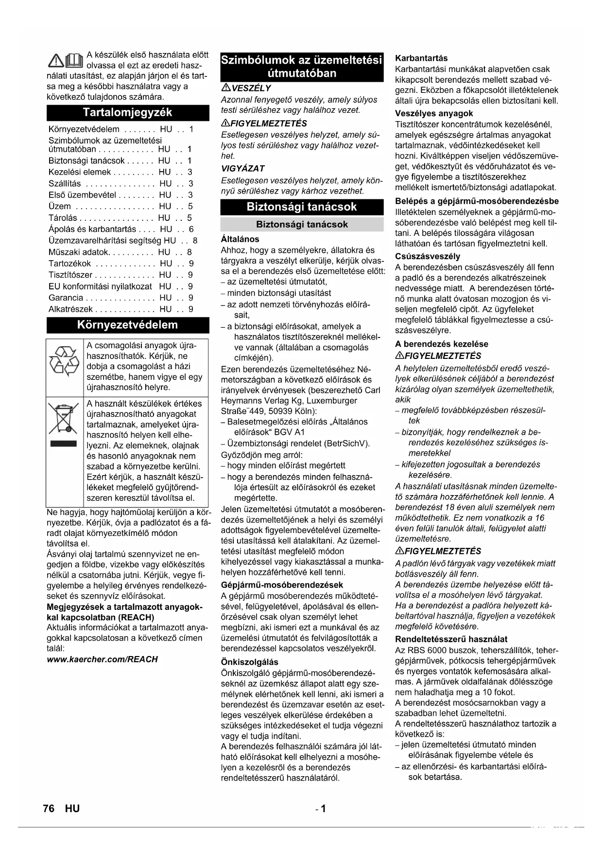 - Таким образом, в данном примере код 30190 означает дату выпуска 09 /(2)013. 75RU- 1 A készülék első használata előtt olvassa el ezt az eredeti hasz- nálati utasítást, ez alapján járjon el és tart- sa meg a későbbi használatra vagy a következő tulajdonos számára. Ne hagyja, hogy hajtóműolaj kerüljön a kör- nyezetbe. Kérjük, óvja a padlózatot és a fá- radt olajat környezetkímélő módon távolítsa el. Ásványi olaj tartalmú szennyvizet ne en- gedjen a földbe, vizekbe vagy előkészítés nélkül a csatornába jutni. Kérjük, vegye fi- gyelembe a helyileg érvényes rendelkezé- seket és szennyvíz előírásokat. Megjegyzések a tartalmazott anyagok- kal kapcsolatban (REACH) Aktuális információkat a tartalmazott anya- gokkal kapcsolatosan a következő címen talál: www.kaercher.com/REACH VESZÉLY Azonnal fenyegető veszély, amely súlyos testi sérüléshez vagy halálhoz vezet. 몇 FIGYELMEZTETÉS Esetlegesen veszélyes helyzet, amely sú- lyos testi sérüléshez vagy halálhoz vezet- het. VIGYÁZAT Esetlegesen veszélyes helyzet, amely kön- nyű sérüléshez vagy kárhoz vezethet. Ahhoz, hogy a személyekre, állatokra és tárgyakra a veszélyt elkerülje, kérjük olvas- sa el a berendezés első üzemeltetése előtt: – az üzemeltetési útmutatót, – minden biztonsági utasítást – az adott nemzeti törvényhozás előírá- sait, – a biztonsági előírásokat, amelyek a használatos tisztítószereknél mellékel- ve vannak (általában a csomagolás címkéjén). Ezen berendezés üzemeltetéséhez Né- metországban a következő előírások és irányelvek érvényesek (beszerezhető Carl Heymanns Verlag Kg, Luxemburger Straße¨449, 50939 Köln): – Balesetmegelőzési előírás „Általános előírások“ BGV A1 – Üzembiztonsági rendelet (BetrSichV). Győződjön meg arról: – hogy minden előírást megértett – hogy a berendezés minden felhaszná- lója értesült az előírásokról és ezeket megértette. Jelen üzemeltetési útmutatót a mosóberen- dezés üzemeltetőjének a helyi és személyi adottságok figyelembevételével üzemelte- tési utasítássá kell átalakítani. Az üzemel- tetési utasítást megfelelő módon kihelyezéssel vagy kiakasztással a munka- helyen hozzáférhetővé kell tenni. A gépjármű mosóberendezés működteté- sével, felügyeletével, ápolásával és ellen- őrzésével csak olyan személyt lehet megbízni, aki ismeri ezt a munkával és az üzemelési útmutatót és felvilágosították a berendezéssel kapcsolatos veszélyekről. Önkiszolgáló gépjármű-mosóberendezé- seknél az üzemkész állapot alatt egy sze- mélynek elérhetőnek kell lenni, aki ismeri a berendezést és üzemzavar esetén az eset- leges veszélyek elkerülése érdekében a szükséges intézkedéseket el tudja végezni vagy el tudja indítani. A berendezés felhasználói számára jól lát- ható előírásokat kell elhelyezni a mosóhe- lyen a kezelésről és a berendezés rendeltetésszerű használatáról. Karbantartási munkákat alapvetően csak kikapcsolt berendezés mellett szabad vé- gezni. Eközben a főkapcsolót illetéktelenek általi újra bekapcsolás ellen biztosítani kell. Tisztítószer koncentrátumok kezelésénél, amelyek egészségre ártalmas anyagokat tartalmaznak, védőintézkedéseket kell hozni. Kiváltképpen viseljen védőszemüve- get, védőkesztyűt és védőruházatot és ve- gye figyelembe a tisztítószerekhez mellékelt ismertető/biztonsági adatlapokat. Illetéktelen személyeknek a gépjármű-mo- sóberendezésbe való belépést meg kell til- tani. A belépés tilosságára világosan láthatóan és tartósan figyelmeztetni kell. A berendezésben csúszásveszély áll fenn a padló és a berendezés alkatrészeinek nedvessége miatt. A berendezésen törté- nő munka alatt óvatosan mozogjon és vi- seljen megfelelő cipőt. Az ügyfeleket megfelelő táblákkal figyelmeztesse a csú- szásveszélyre. 몇 FIGYELMEZTETÉS A helytelen üzemeltetésből eredő veszé- lyek elkerülésének céljából a berendezést kizárólag olyan személyek üzemeltethetik, akik – megfelelő továbbképzésben részesül- tek – bizonyítják, hogy rendelkeznek a be- rendezés kezeléséhez szükséges is- meretekkel – kifejezetten jogosultak a berendezés kezelésére. A használati utasításnak minden üzemelte- tő számára hozzáférhetőnek kell lennie. A berendezést 18 éven aluli személyek nem működtethetik. Ez nem vonatkozik a 16 éven felüli tanulók általi, felügyelet alatti üzemeltetésre. 몇 FIGYELMEZTETÉS A padlón lévő tárgyak vagy vezetékek miatt botlásveszély áll fenn. A berendezés üzembe helyezése előtt tá- volítsa el a mosóhelyen lévő tárgyakat. Ha a berendezést a padlóra helyezett ká- beltartóval használja, figyeljen a vezetékek megfelelő követésére. Az RBS 6000 buszok, teherszállítók, teher- gépjárművek, pótkocsis tehergépjárművek és nyerges vontatók kefemosására alkal- mas. A járművek oldalfalának dőlésszöge nem haladhatja meg a 10 fokot. A berendezést mosócsarnokban vagy a szabadban lehet üzemeltetni. A rendeltetésszerű használathoz tartozik a következő is: – jelen üzemeltetési útmutató minden előírásának figyelembe vétele és – az ellenőrzési- és karbantartási előírá- sok betartása. Tartalomjegyzék Környezetvédelem