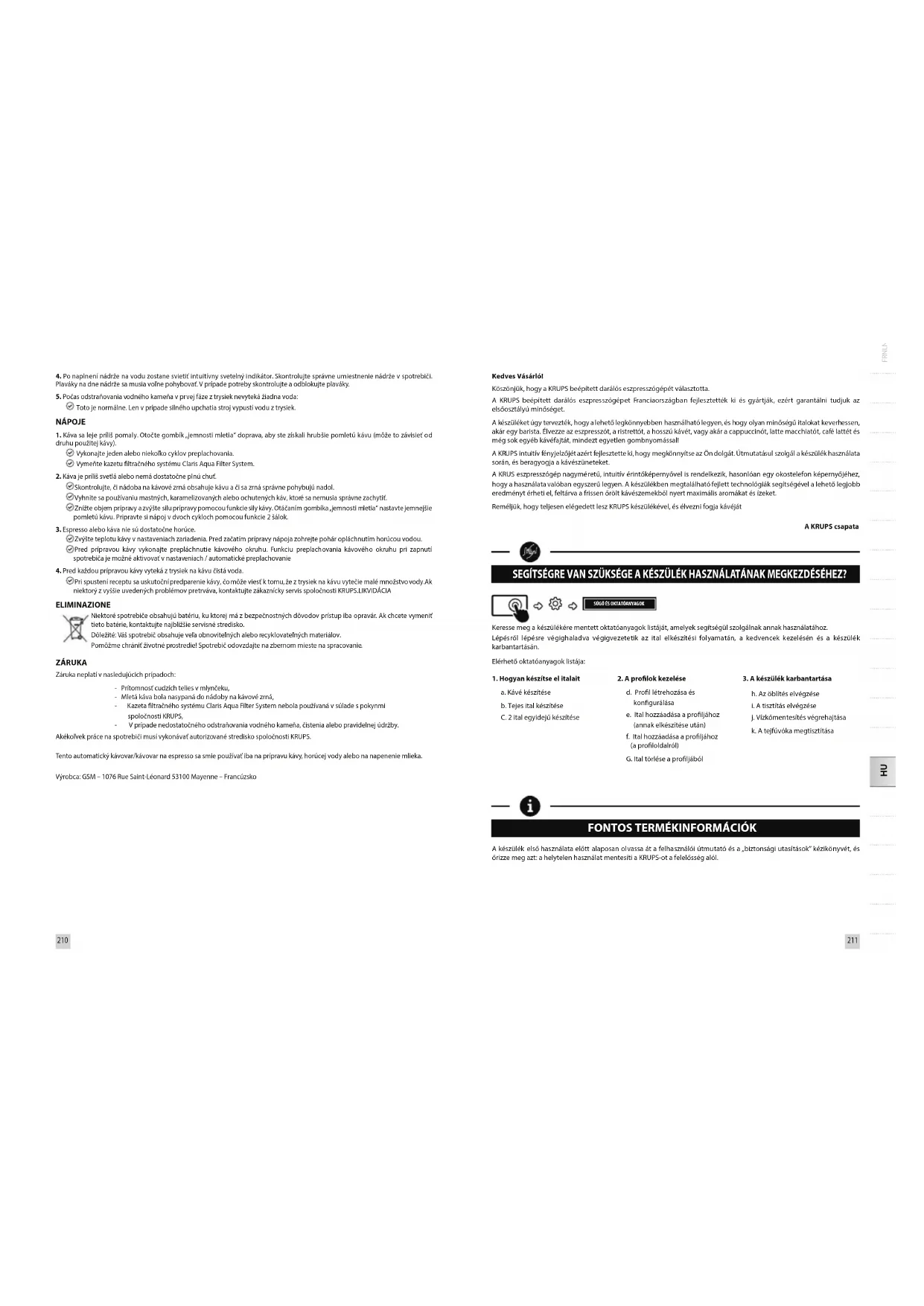 Pri spustení receptu sa uskutoční predparenie kávy, čo môže viesť k tomu, že z trysiek na kávu vytečie malé množstvo vody.Ak niektorý z vyššie uvedených problémov pretrváva, kontaktujte zákaznícky servis spoločnosti KRUPS.LIKVIDÁCIA ELIMINAZIONE Niektoré spotrebiče obsahujú batériu, ku ktorej má z bezpečnostných dôvodov prístup iba opravár. Ak chcete vymeniť tieto batérie, kontaktujte najbližšie servisné stredisko. Dôležité: Váš spotrebič obsahuje veľa obnoviteľných alebo recyklovateľných materiálov. Pomôžme chrániť životné prostredie! Spotrebič odovzdajte na zbernom mieste na spracovanie. ZÁRUKA Záruka neplatí v nasledujúcich prípadoch: - Prítomnosť cudzích telies v mlynčeku, - Mletá káva bola nasypaná do nádoby na kávové zrná, - Kazeta ltračného systému Claris Aqua Filter System nebola používaná v súlade s pokynmi spoločnosti KRUPS, - V prípade nedostatočného odstraňovania vodného kameňa, čistenia alebo pravidelnej údržby. Akékoľvek práce na spotrebiči musí vykonávať autorizované stredisko spoločnosti KRUPS. Tento automatický kávovar/kávovar na espresso sa smie používať iba na prípravu kávy, horúcej vody alebo na napenenie mlieka. Výrobca: GSM – 1076 Rue Saint-Léonard 53100 Mayenne – Francúzsko Kedves Vásárló! Köszönjük, hogy a KRUPS beépített darálós eszpresszógépét választotta. A KRUPS beépített darálós eszpresszógépet Franciaországban fejlesztették ki és gyártják, ezért garantálni tudjuk az elsőosztályú minőséget. A készüléket úgy tervezték, hogy a lehető legkönnyebben használható legyen, és hogy olyan minőségű italokat keverhessen, akár egy barista. Élvezze az eszpresszót, a ristrettót, a hosszú kávét, vagy akár a cappuccinót, latte macchiatót, café lattét és még sok egyéb kávéfajtát, mindezt egyetlen gombnyomással! A KRUPS intuitív fényjelzőjét azért fejlesztette ki, hogy megkönnyítse az Ön dolgát. Útmutatásul szolgál a készülék használata során, és beragyogja a kávészüneteket. A KRUS eszpresszógép nagyméretű, intuitív érintőképernyővel is rendelkezik, hasonlóan egy okostelefon képernyőjéhez, hogy a használata valóban egyszerű legyen. A készülékben megtalálható fejlett technológiák segítségével a lehető legjobb eredményt érheti el, feltárva a frissen őrölt kávészemekből nyert maximális aromákat és ízeket. Reméljük, hogy teljesen elégedett lesz KRUPS készülékével, és élvezni fogja kávéját A KRUPS csapata SEGÍTSÉGRE VAN SZÜKSÉGE A KÉSZÜLÉK HASZNÁLATÁNAK MEGKEZDÉSÉHEZ?