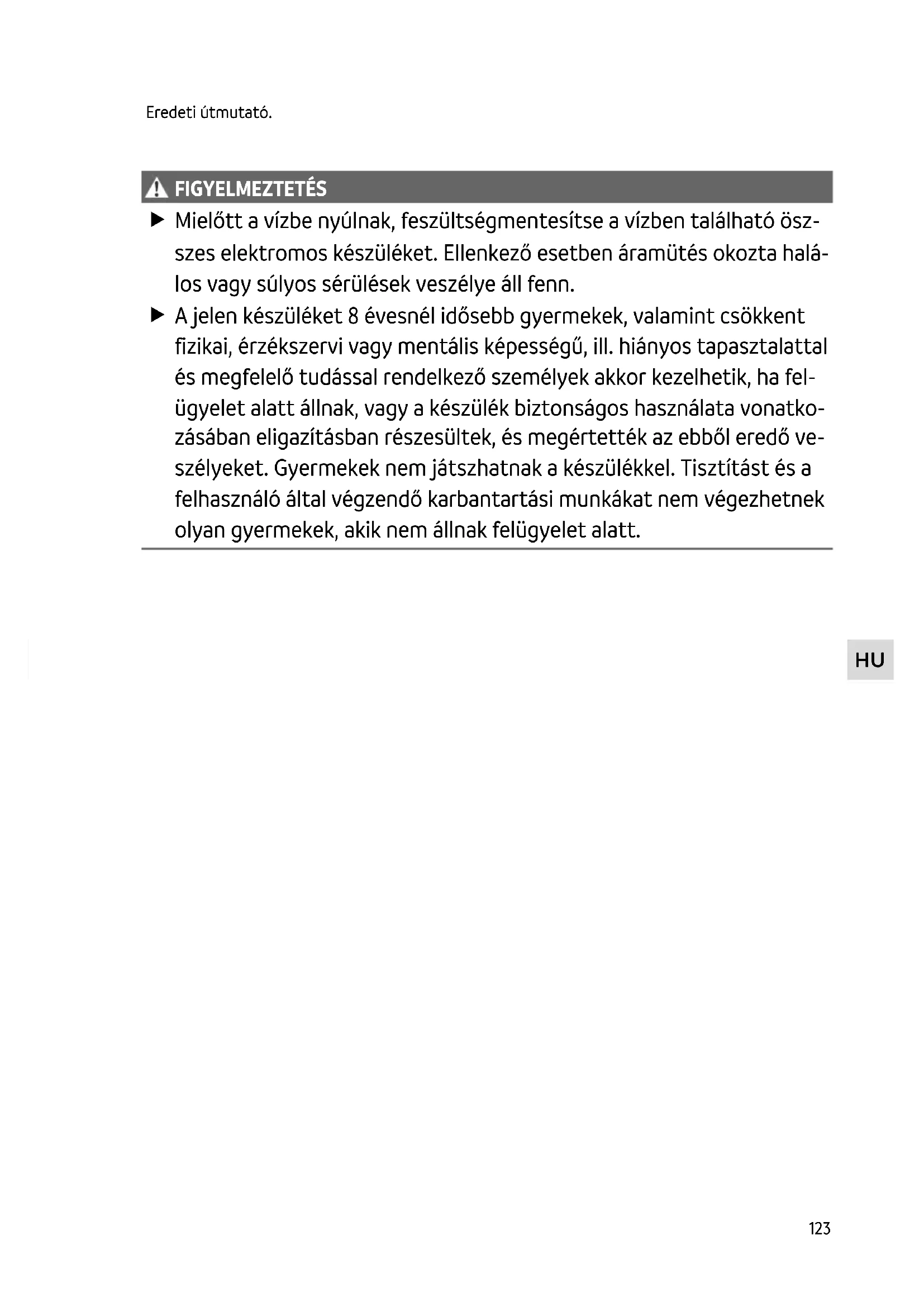 FIGYELMEZTETÉS Mielőtt a vízbe nyúlnak, feszültségmentesítse a vízben található ösz- szes elektromos készüléket. Ellenkező esetben áramütés okozta halá- los vagy súlyos sérülések veszélye áll fenn. A jelen készüléket 8 évesnél idősebb gyermekek, valamint csökkent fizikai, érzékszervi vagy mentális képességű, ill. hiányos tapasztalattal és megfelelő tudással rendelkező személyek akkor kezelhetik, ha fel- ügyelet alatt állnak, vagy a készülék biztonságos használata vonatko- zásában eligazításban részesültek, és megértették az ebből eredő ve- szélyeket. Gyermekek nem játszhatnak a készülékkel. Tisztítást és a felhasználó által végzendő karbantartási munkákat nem végezhetnek olyan gyermekek, akik nem állnak felügyelet alatt.124 Biztonsági útmutatások Elektromos csatlakoztatás
