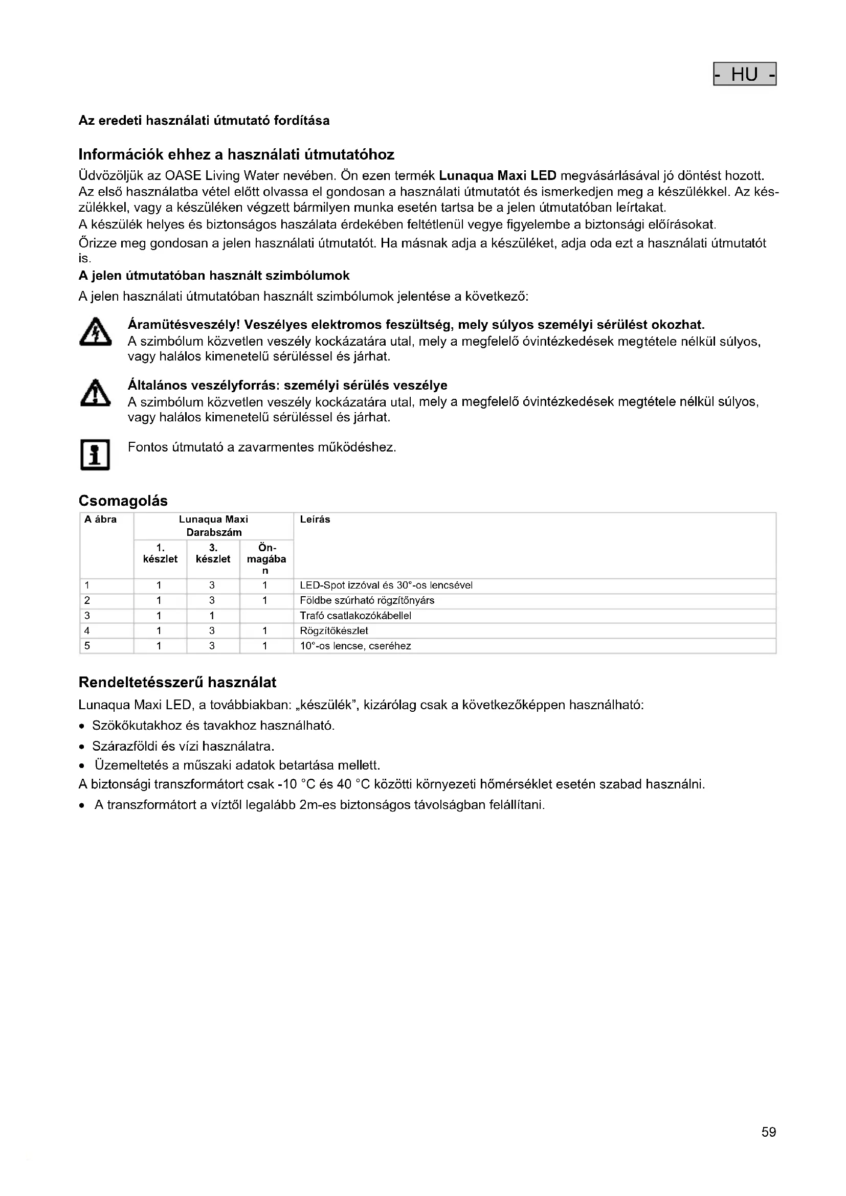 Információk ehhez a használati útmutatóhoz Üdvözöljük az OASE Living Water nevében. Ön ezen termék Lunaqua Maxi LED megvásárlásával jó döntést hozott. Az első használatba vétel előtt olvassa el gondosan a használati útmutatót és ismerkedjen meg a készülékkel. Az kés- zülékkel, vagy a készüléken végzett bármilyen munka esetén tartsa be a jelen útmutatóban leírtakat. A készülék helyes és biztonságos haszálata érdekében feltétlenül vegye figyelembe a biztonsági előírásokat. Őrizze meg gondosan a jelen használati útmutatót. Ha másnak adja a készüléket, adja oda ezt a használati útmutatót is. A jelen útmutatóban használt szimbólumok