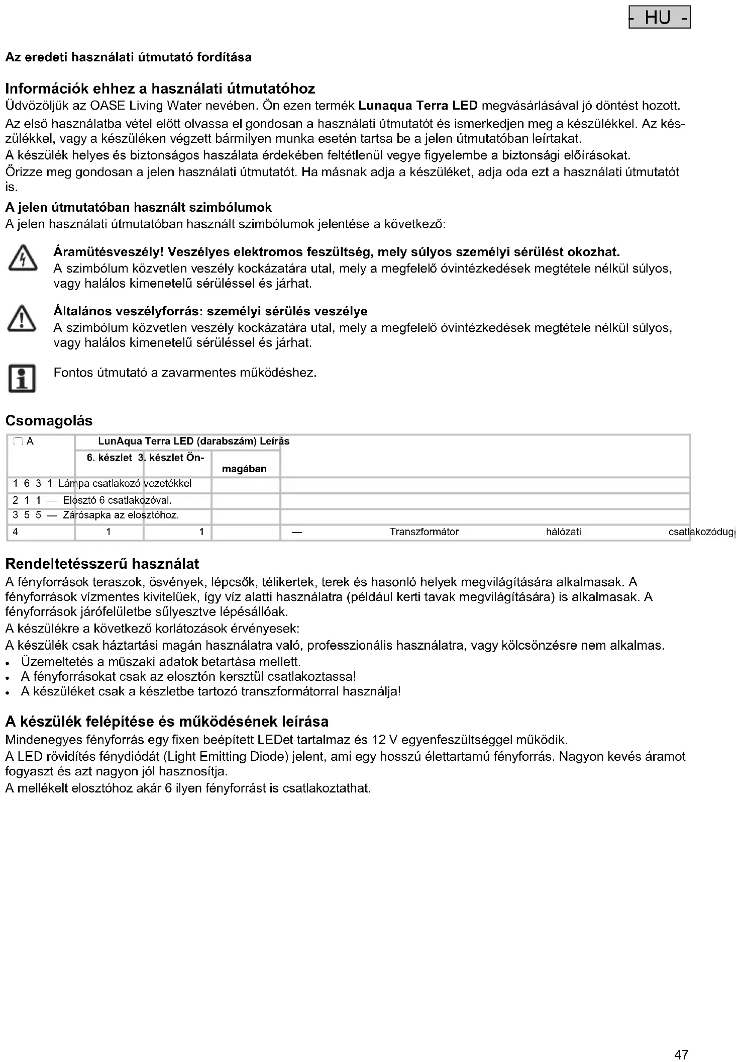 - HU - Az eredeti használati útmutató fordítása Információk ehhez a használati útmutatóhoz Üdvözöljük az OASE Living Water nevében. Ön ezen termék Lunaqua Terra LED megvásárlásával jó döntést hozott. Az első használatba vétel előtt olvassa el gondosan a használati útmutatót és ismerkedjen meg a készülékkel. Az kés- zülékkel, vagy a készüléken végzett bármilyen munka esetén tartsa be a jelen útmutatóban leírtakat. A készülék helyes és biztonságos haszálata érdekében feltétlenül vegye figyelembe a biztonsági előírásokat. Őrizze meg gondosan a jelen használati útmutatót. Ha másnak adja a készüléket, adja oda ezt a használati útmutatót is. A jelen útmutatóban használt szimbólumok A jelen használati útmutatóban használt szimbólumok jelentése a következő: