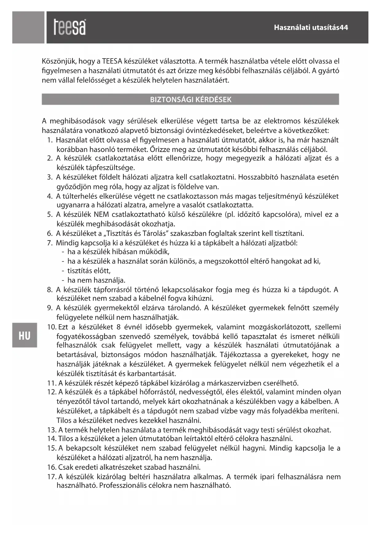 - Το σετ περιλαμβάνει: σίδερο ατμού, δοχείο επαναπλήρωσηςHU Használati utasítás44 Köszönjük, hogy a TEESA készüléket választotta. A termék használatba vétele előtt olvassa el gyelmesen a használati útmutatót és azt őrizze meg későbbi felhasználás céljából. A gyártó nem vállal felelősséget a készülék helytelen használatáért.