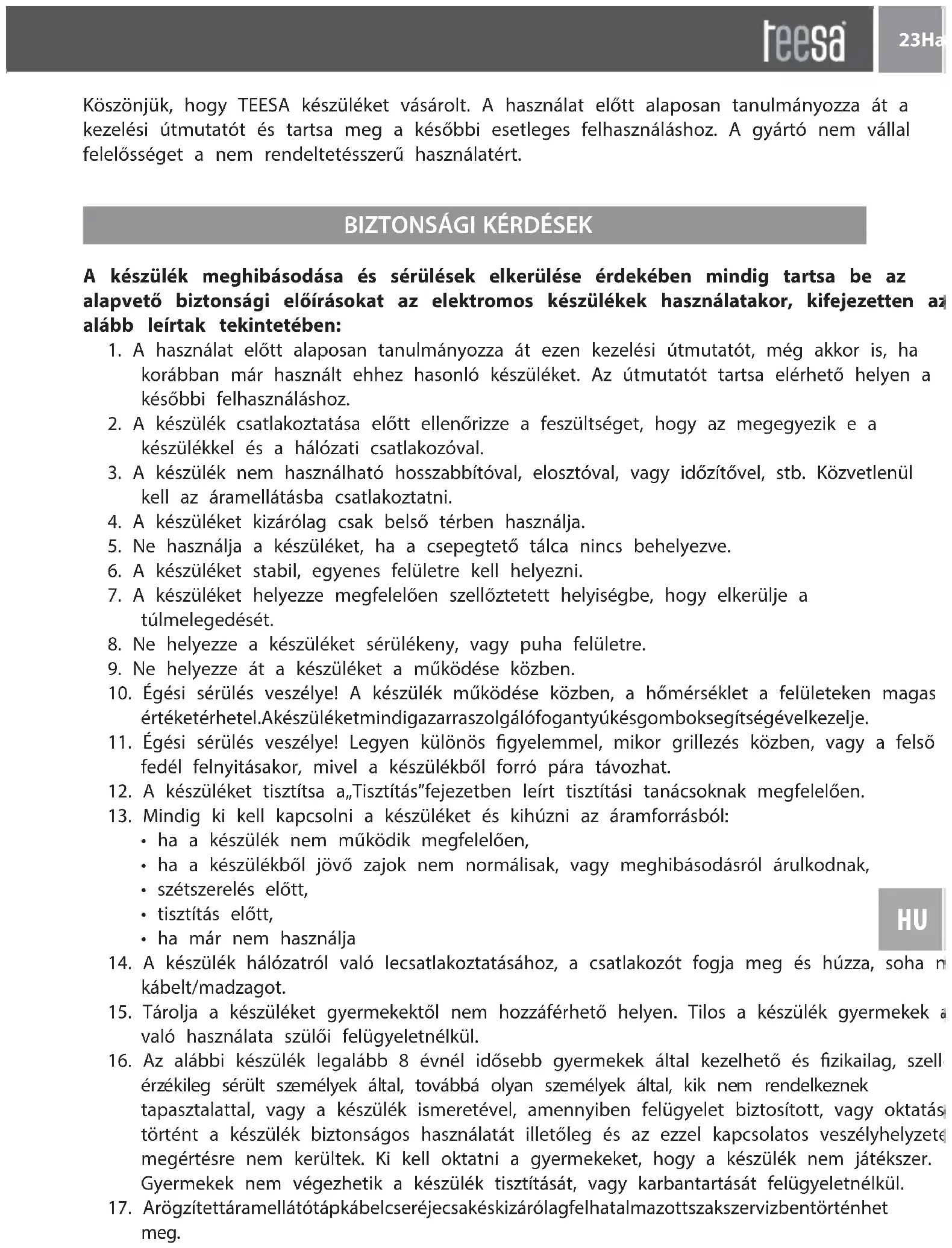 meg. Köszönjük, hogy TEESA készüléket vásárolt. A használat előtt alaposan tanulmányozza át a kezelési útmutatót és tartsa meg a későbbi esetleges felhasználáshoz. A gyártó nem vállal felelősséget a nem rendeltetésszerű használatért. 23Használati utasítás HU24 Használati utasítás