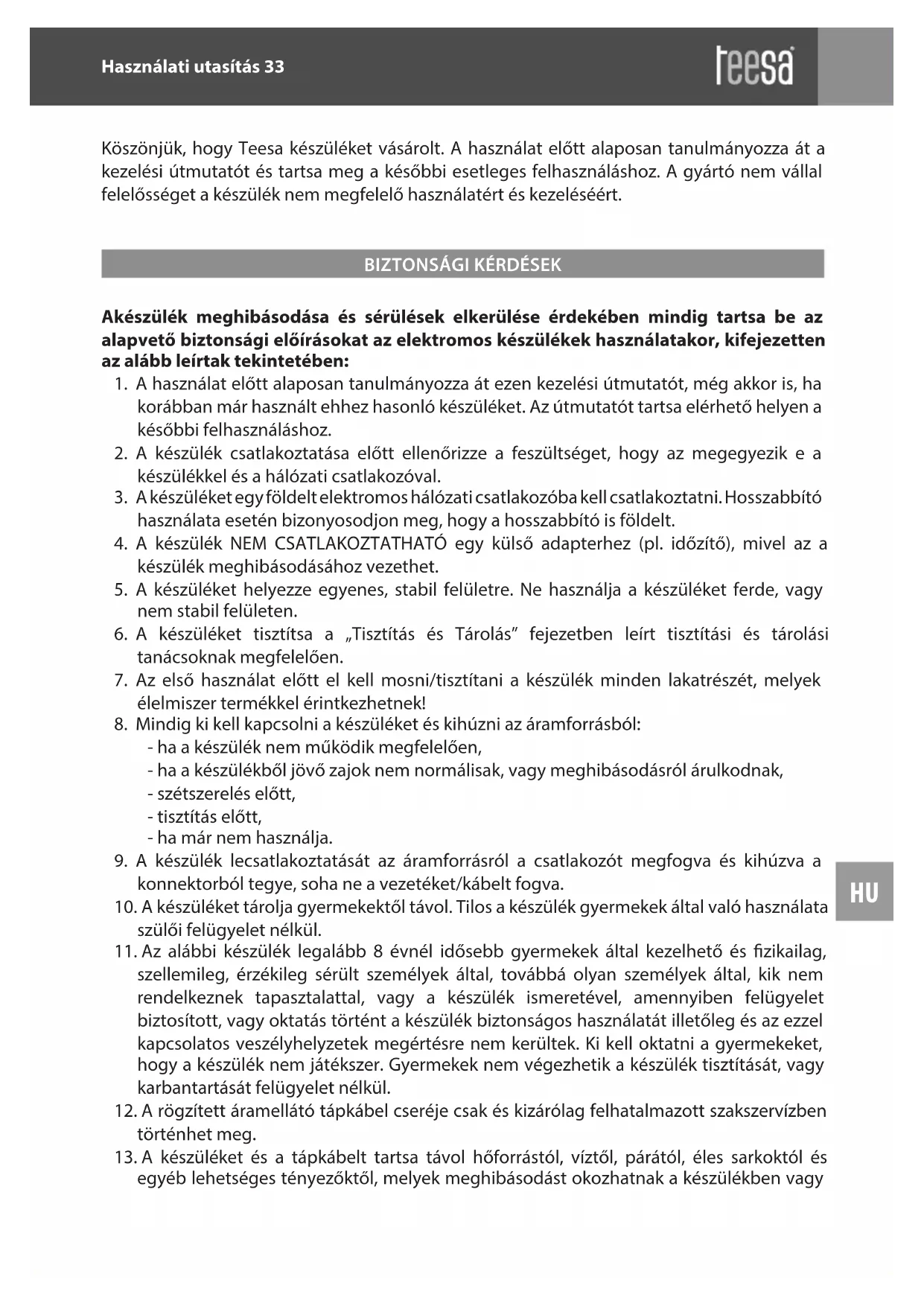 Köszönjük, hogy Teesa készüléket vásárolt. A használat előtt alaposan tanulmányozza át a kezelési útmutatót és tartsa meg a későbbi esetleges felhasználáshoz. A gyártó nem vállal felelősséget a készülék nem megfelelő használatért és kezeléséért.