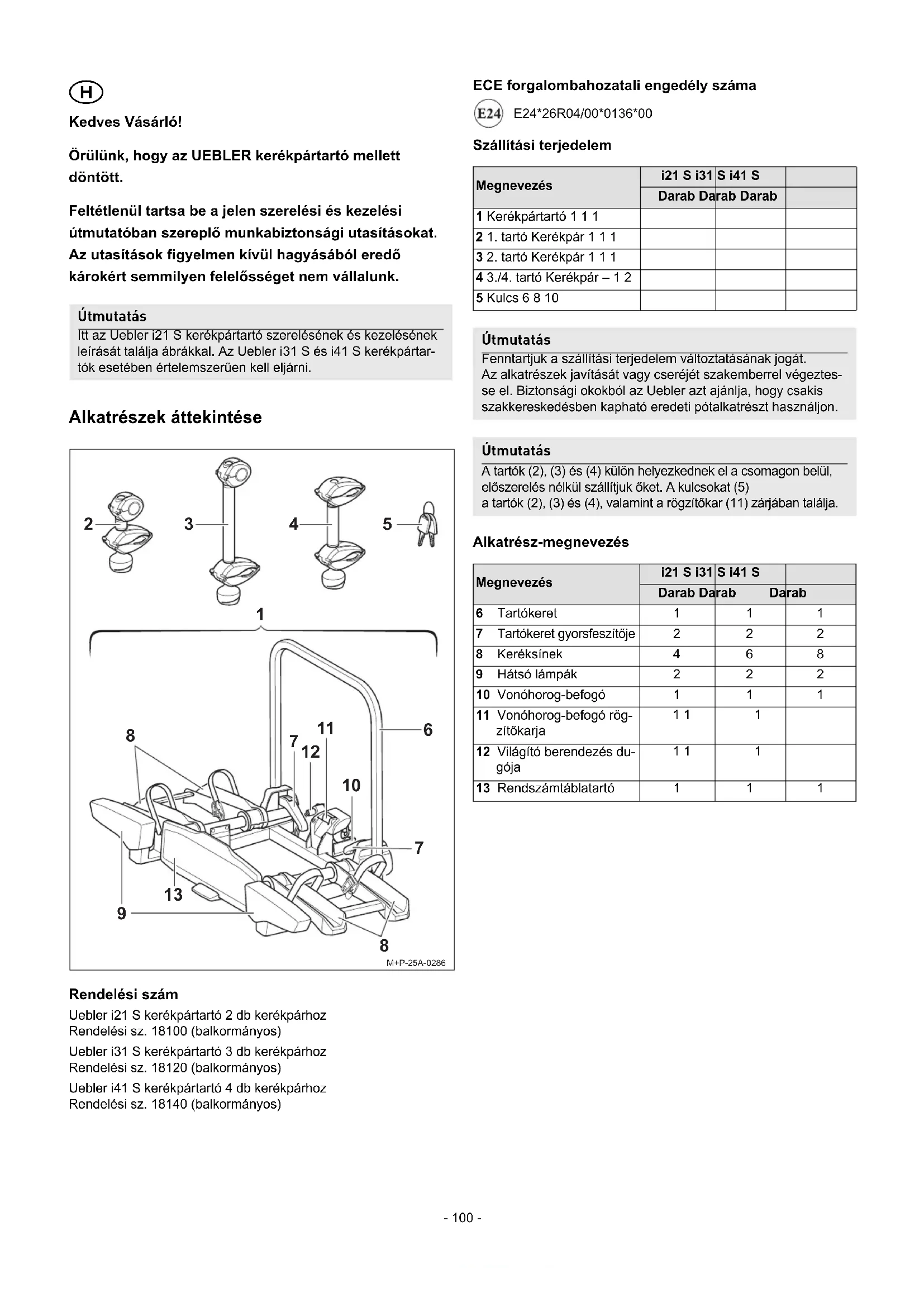 Kedves Vásárló! Örülünk, hogy az UEBLER kerékpártartó mellett döntött. Feltétlenül tartsa be a jelen szerelési és kezelési útmutatóban szereplő munkabiztonsági utasításokat. Az utasítások figyelmen kívül hagyásából eredő károkért semmilyen felelősséget nem vállalunk. Alkatrészek áttekintése Rendelési szám Uebler i21 S kerékpártartó 2 db kerékpárhoz Rendelési sz. 18100 (balkormányos) Uebler i31 S kerékpártartó 3 db kerékpárhoz Rendelési sz. 18120 (balkormányos) Uebler i41 S kerékpártartó 4 db kerékpárhoz Rendelési sz. 18140 (balkormányos) ECE forgalombahozatali engedély száma E24*26R04/00*0136*00 Szállítási terjedelem Alkatrész-megnevezés Útmutatás Itt az Uebler i21 S kerékpártartó szerelésének és kezelésének leírását találja ábrákkal. Az Uebler i31 S és i41 S kerékpártar- tók esetében értelemszerűen kell eljárni.