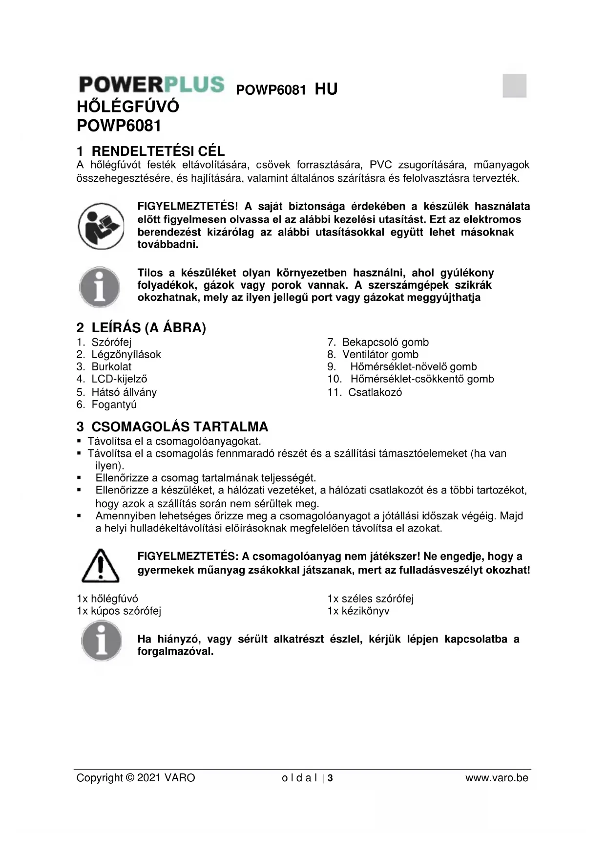 - A javításokhoz kizárólag eredeti pótalkatrészek használhatók, és a javítási műveleteket csak minősített, szakképzett személyzet végezheti. Ez biztosítja eszköze biztonságosságát.POWP6081 HU Copyright © 2021 VARO o l d a l | 6 www.varo.be 6 A HŐLÉGFÚVÓRA VONATKOZÓ KIEGÉSZÍTŐ BIZTONSÁGI