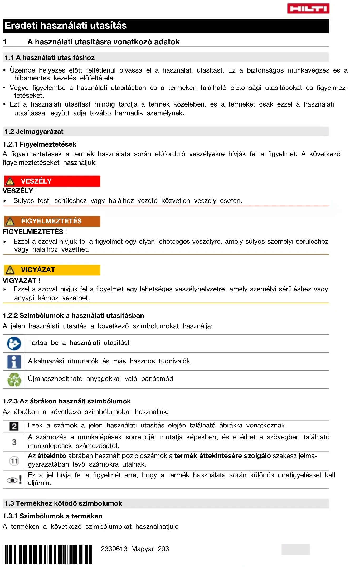 A gyártó kizárólagos felelőssége tudatában kijelenti, hogy ez a termék megfelel az érvényben lévő törvényeknek és szabványoknak. A megfelelőségi nyilatkozat másolatát a dokumentáció végén találja. A műszaki dokumentáció helye: Hilti Entwicklungsgesellschaft mbH | Zulassung Geräte | Hiltistraße 6 | 86916 Kaufering, DE 2 Biztonság