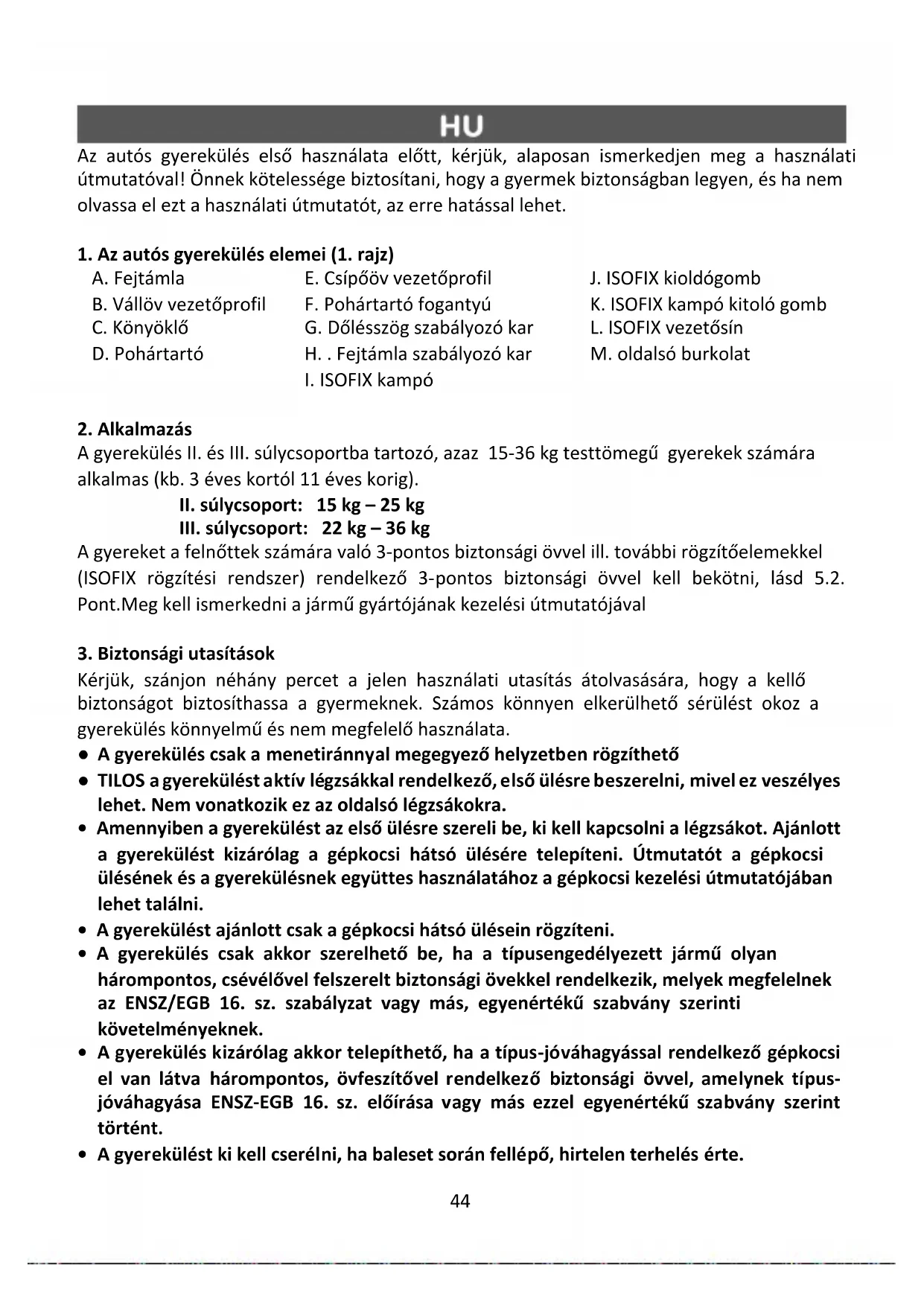 segítségével, II/III. súlycsoportba tartozó gyerekek esetén. FONTOS A gépjármű használati útmutatójában fel van tüntetve a rögzítőpontok helye, valamint a gyerekülés rögzítésére vonatkozó egyéb szükséges információk. A felhasználó FELTÉTLENÜL olvassa el a jármű használati útmutatóját.