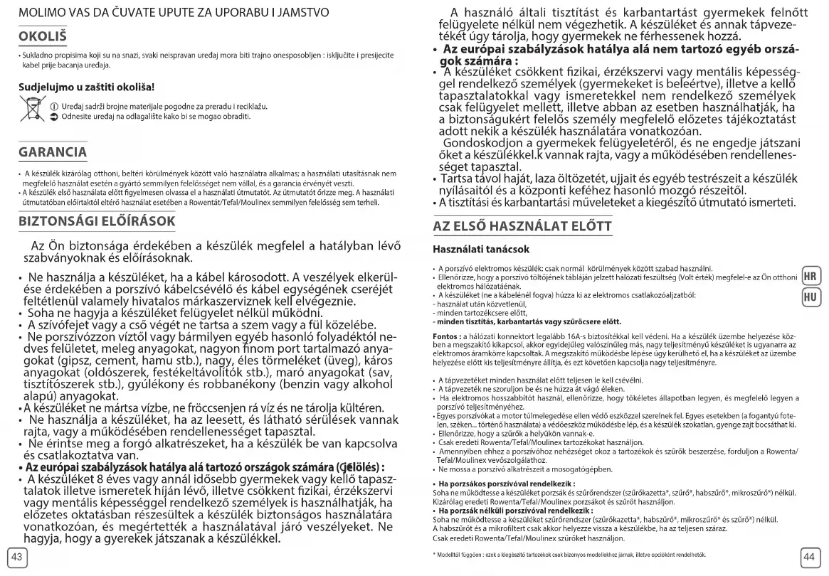 - Egyes porszívókat a motor túlmelegedése ellen védő eszközzel szerelnek fel. Egyes esetekben (a fogantyú fote- len, széken... történő használata) a védőeszköz működésbe lép, és a készülék szokatlan, gyenge zajt bocsáthat ki. • Ellenőrizze, hogy a szűrők a helyükön vannak-e. • Csak eredeti Rowenta/Tefal/Moulinex tartozékokat használjon. • Amennyiben ehhez a porszívóhoz nehézséget okoz a tartozékok és szűrők beszerzése, forduljon a Rowenta/Tefal/Moulinex vevőszolgálathoz. • Ne mossa a porszívó alkatrészeit a mosogatógépben.• Ha porzsákos porszívóval rendelkezik : Soha ne működtesse a készüléket porzsák és szűrőrendszer (szűrőkazetta*, szűrő*, habszűrő*, mikroszűrő*) nélkül.Kizárólag eredeti Rowenta/Tefal/Moulinex porzsákot és szűrőt használjon. • Ha porzsák nélküli porszívóval rendelkezik :Soha ne működtesse a készüléket szűrőrendszer (szűrőkazetta*, habszűrő*, mikroszűrő* és szűrő*) nélkül.A habszűrőt és a mikroltert csak akkor helyezze vissza a készülékbe, ha az teljesen száraz.Csak eredeti Rowenta/Tefal/Moulinex szűrőket használjon. GARANCIA