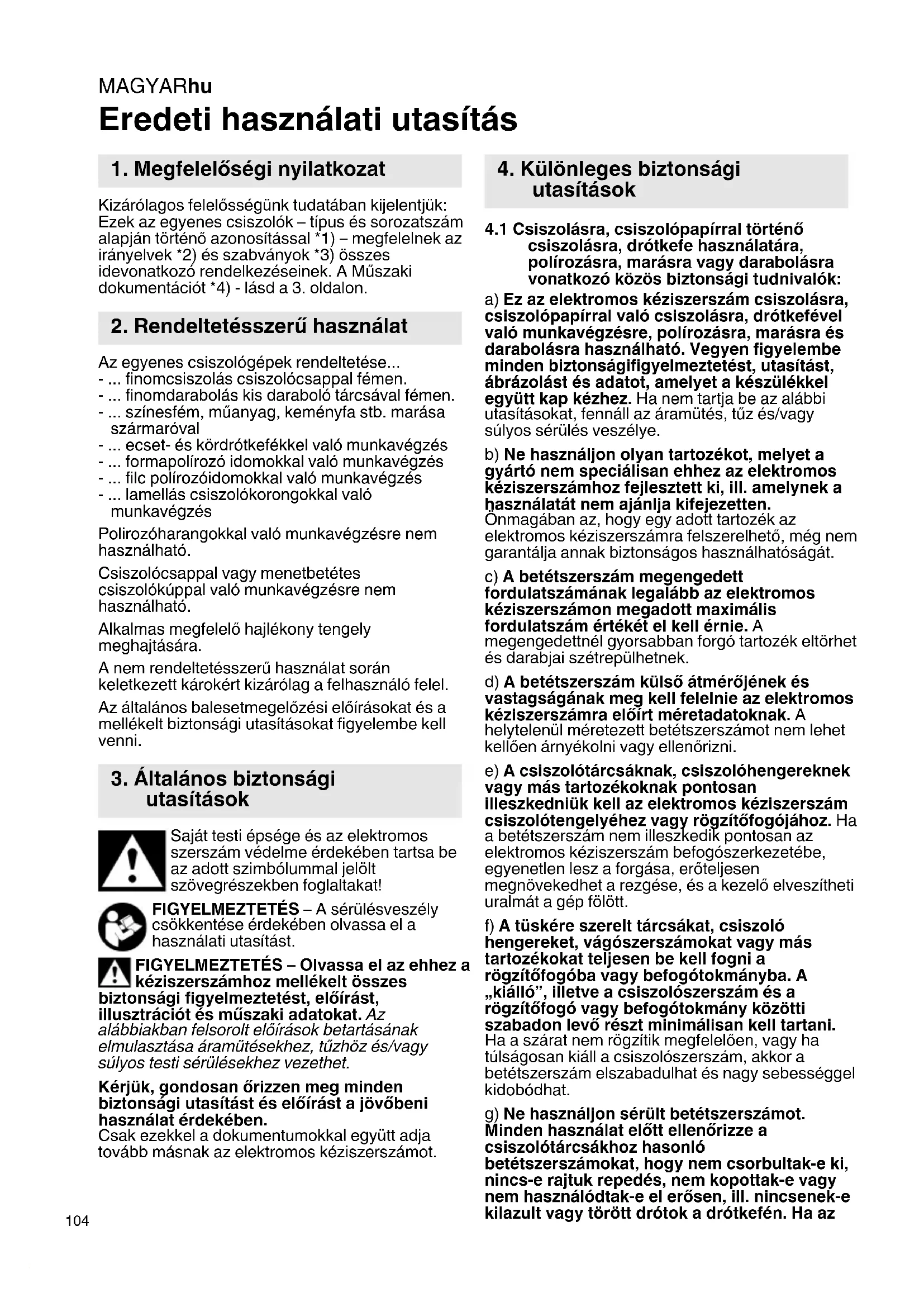 FIGYELMEZTETÉS – Mindig viseljen védőszemüveget. Viseljen hallásvédő felszerelést. FIGYELEM – Az elektromos szerszámot mindig két kézzel tartva kell használni. Használjon rugalmas alátétet, ha mellékeltek olyat a csiszolóeszközhöz, és ha annak használata előírás. Vegye figyelembe a szerszám vagy tartozék gyártója által közölt adatokat! Védje a tárcsát a zsírtól és az ütésektől! A betétszerszámokat gondosan, a gyártó előírásai szerint kell tárolni és használni. Soha ne használja a daraboló-csiszolótárcsát nagyoló csiszolásra! A daraboló-csiszolótárcsát nem szabad oldalirányú nyomásnak kitenni. A munkadarabnak szorosan kell feküdnie és azt csúszás ellen biztosítani kell, pl. befogó szerkezet segítségével. A nagy munkadarabokat megfelelően alá kell támasztani. A tengelyreteszelést (4) (modelltől függ) csak álló motornál működtesse.MAGYAR hu