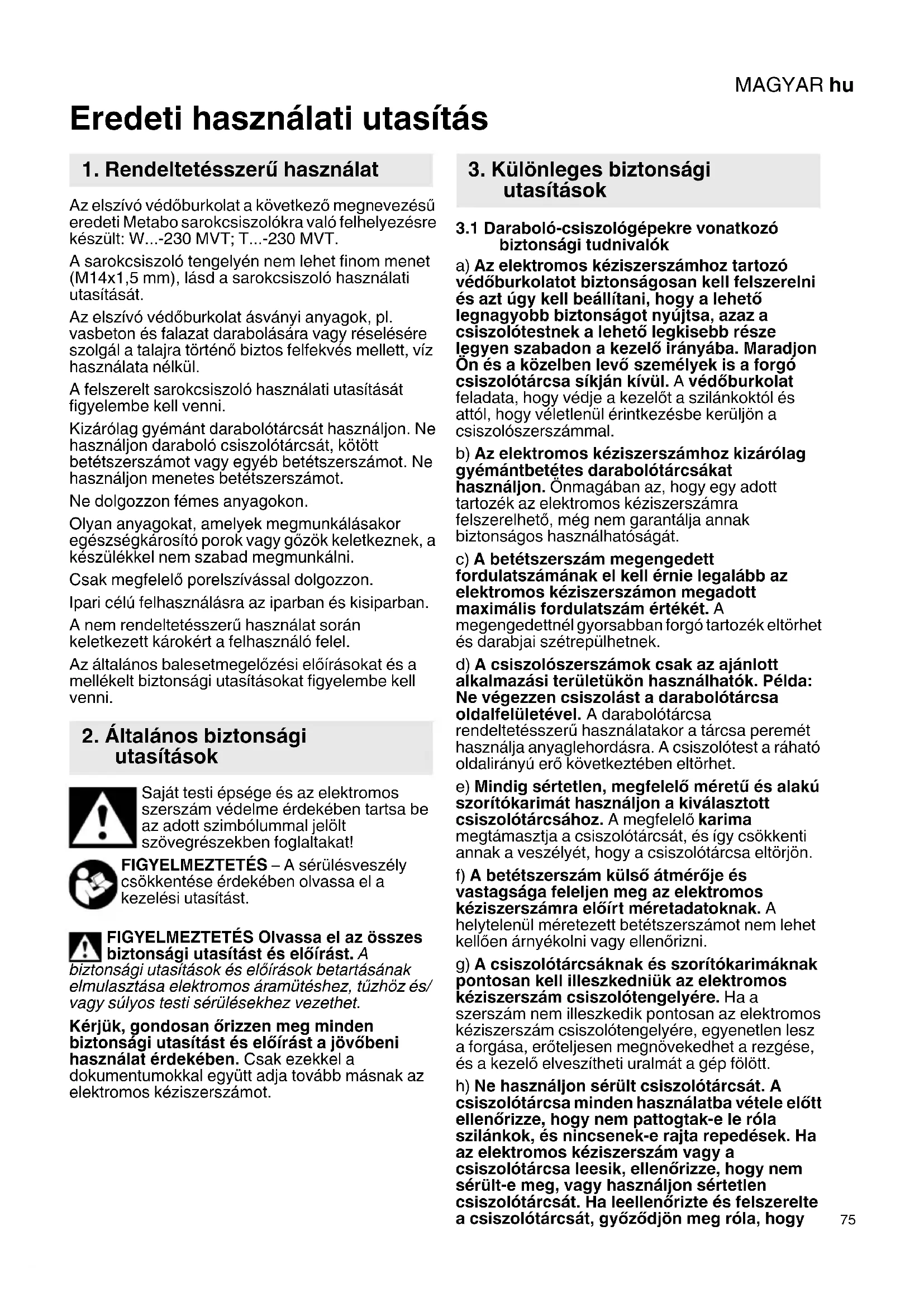 Eredeti használati utasítás Az elszívó védőburkolat a következő megnevezésű eredeti Metabo sarokcsiszolókra való felhelyezésre készült: W...-230 MVT; T...-230 MVT. A sarokcsiszoló tengelyén nem lehet finom menet (M14x1,5 mm), lásd a sarokcsiszoló használati utasítását. Az elszívó védőburkolat ásványi anyagok, pl. vasbeton és falazat darabolására vagy réselésére szolgál a talajra történő biztos felfekvés mellett, víz használata nélkül. A felszerelt sarokcsiszoló használati utasítását figyelembe kell venni. Kizárólag gyémánt darabolótárcsát használjon. Ne használjon daraboló csiszolótárcsát, kötött betétszerszámot vagy egyéb betétszerszámot. Ne használjon menetes betétszerszámot. Ne dolgozzon fémes anyagokon. Olyan anyagokat, amelyek megmunkálásakor egészségkárosító porok vagy gőzök keletkeznek, a készülékkel nem szabad megmunkálni. Csak megfelelő porelszívással dolgozzon. Ipari célú felhasználásra az iparban és kisiparban. A nem rendeltetésszerű használat során keletkezett károkért a felhasználó felel. Az általános balesetmegelőzési előírásokat és a mellékelt biztonsági utasításokat figyelembe kell venni. Saját testi épsége és az elektromos szerszám védelme érdekében tartsa be az adott szimbólummal jelölt szövegrészekben foglaltakat! FIGYELMEZTETÉS – A sérülésveszély csökkentése érdekében olvassa el a kezelési utasítást. FIGYELMEZTETÉS Olvassa el az összes biztonsági utasítást és előírást. A biztonsági utasítások és előírások betartásának elmulasztása elektromos áramütéshez, tűzhöz és/ vagy súlyos testi sérülésekhez vezethet. Kérjük, gondosan őrizzen meg minden biztonsági utasítást és előírást a jövőbeni használat érdekében. Csak ezekkel a dokumentumokkal együtt adja tovább másnak az elektromos kéziszerszámot.