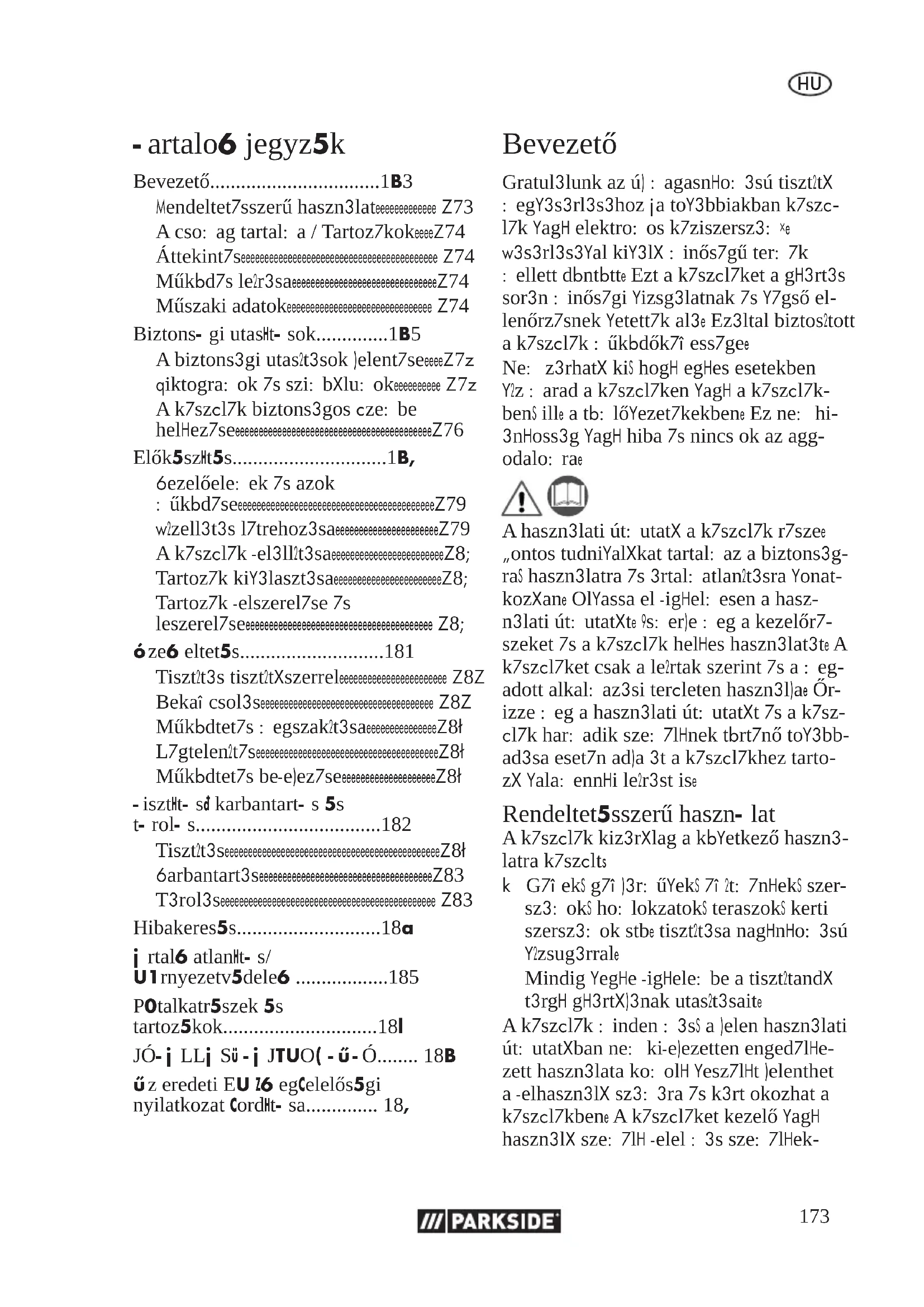 - Az eredeti EK ‑megfelelőségi nyilatkozat fordítása Bevezető Gratulálunk az új magasnyomású tisztító megvásárlásához (a továbbiakban készü- lék vagy elektromos kéziszerszám). Vásárlásával kiváló minőségű termék mellett döntött. Ezt a készüléket a gyártás során minőségi vizsgálatnak és végső el- lenőrzésnek vetették alá. Ezáltal biztosított a készülék működőképessége. Nem zárható ki, hogy egyes esetekben víz marad a készüléken vagy a készülék- ben, ill. a tömlővezetékekben. Ez nem hi- ányosság vagy hiba és nincs ok az agg- odalomra. A használati útmutató a készülék része. Fontos tudnivalókat tartalmaz a biztonság- ra, használatra és ártalmatlanításra vonat- kozóan. Olvassa el figyelmesen a hasz- nálati útmutatót. Ismerje meg a kezelőré- szeket és a készülék helyes használatát. A készüléket csak a leírtak szerint és a meg- adott alkalmazási területen használja. Őr- izze meg a használati útmutatót és a kész- ülék harmadik személynek történő tovább- adása esetén adja át a készülékhez tarto- zó valamennyi leírást is. Rendeltetésszerű használat A készülék kizárólag a következő haszná- latra készült: p. 189