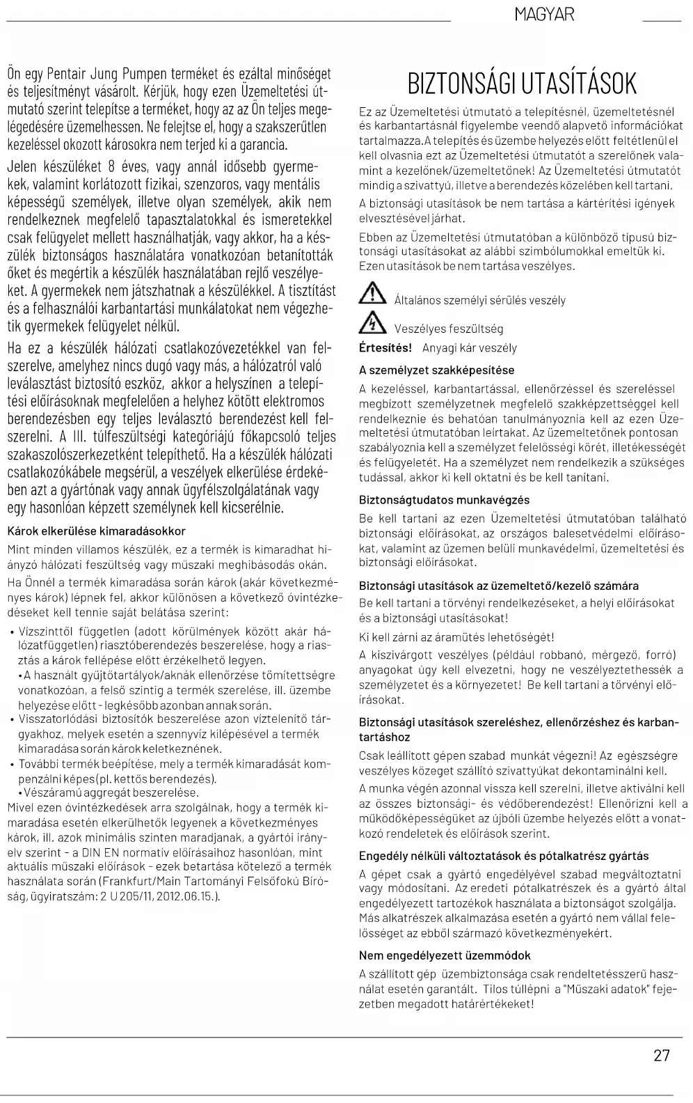 - nesprávny smer otáčania pri trojfázovom prúde = odborným elektrikárom nechajte vymeniť 2 fázy prívodného vedenia27 MAGYAR Ön egy Pentair Jung Pumpen terméket és ezáltal minőséget és teljesítményt vásárolt. Kérjük, hogy ezen Üzemeltetési út- mutató szerint telepítse a terméket, hogy az az Ön teljes mege- légedésére üzemelhessen. Ne felejtse el, hogy a szakszerűtlen kezeléssel okozott károsokra nem terjed ki a garancia. Jelen készüléket 8 éves, vagy annál idősebb gyerme- kek, valamint korlátozott zikai, szenzoros, vagy mentális képességű személyek, illetve olyan személyek, akik nem rendelkeznek megfelelő tapasztalatokkal és ismeretekkel csak felügyelet mellett használhatják, vagy akkor, ha a kés- zülék biztonságos használatára vonatkozóan betanították őket és megértik a készülék használatában rejlő veszélye- ket. A gyermekek nem játszhatnak a készülékkel. A tisztítást és a felhasználói karbantartási munkálatokat nem végezhe- tik gyermekek felügyelet nélkül. Ha ez a készülék hálózati csatlakozóvezetékkel van fel- szerelve, amelyhez nincs dugó vagy más, a hálózatról való leválasztást biztosító eszköz, akkor a helyszínen a telepí- tési előírásoknak megfelelően a helyhez kötött elektromos berendezésben egy teljes leválasztó berendezést kell fel- szerelni. A III. túlfeszültségi kategóriájú főkapcsoló teljes szakaszolószerkezetként telepíthető. Ha a készülék hálózati csatlakozókábele megsérül, a veszélyek elkerülése érdeké- ben azt a gyártónak vagy annak ügyfélszolgálatának vagy egy hasonlóan képzett személynek kell kicserélnie. Károk elkerülése kimaradásokkor Mint minden villamos készülék, ez a termék is kimaradhat hi- ányzó hálózati feszültség vagy műszaki meghibásodás okán. Ha Önnél a termék kimaradása során károk (akár következmé- nyes károk) lépnek fel, akkor különösen a következő óvintézke- déseket kell tennie saját belátása szerint: