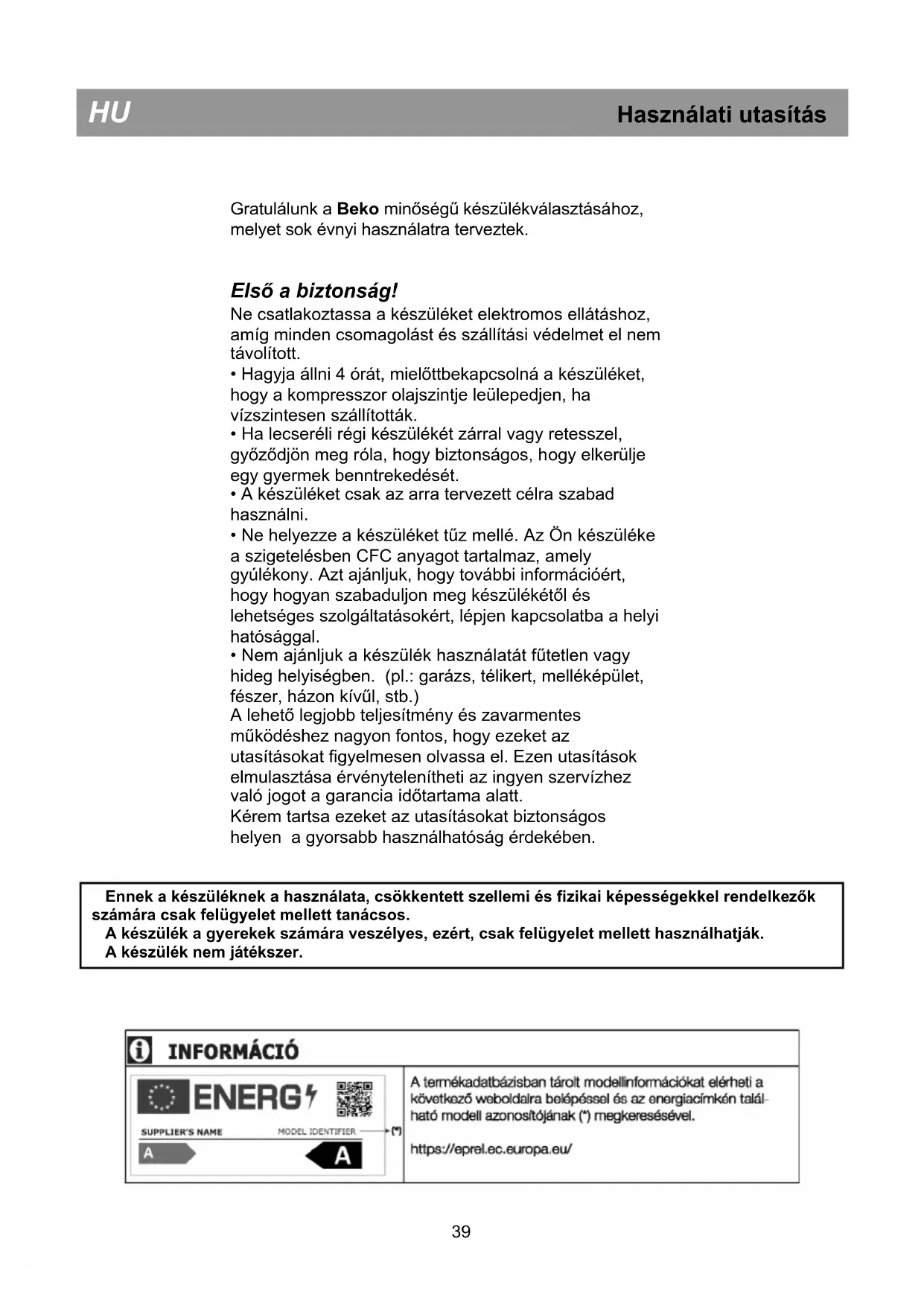 Ennek a készüléknek a használata, csökkentett szellemi és fizikai képességekkel rendelkezők számára csak felügyelet mellett tanácsos. A készülék a gyerekek számára veszélyes, ezért, csak felügyelet mellett használhatják. A készülék nem