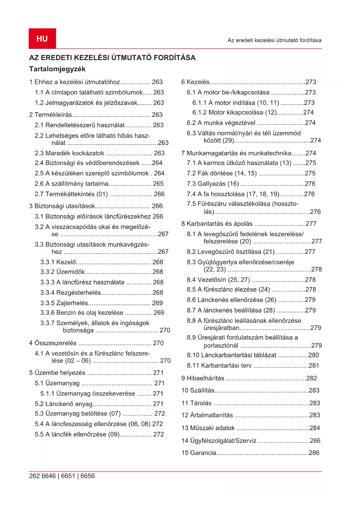 Sz. Alkatrész 1 Vezetősín 2 Fűrészlánc 3 Benzines láncfűrész 4 A vezetősín védőtokja 5 Reszelő 6 Csavarhúzó 7 Kombinált kulcsHU 266 6646 | 6651 | 6656 Biztonsági utasítások Sz. Alkatrész 8 Üzemeltetési útmutató