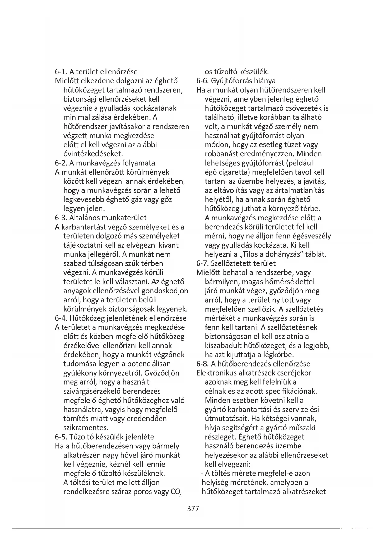 információ.377 6-1. A terület ellenőrzése Mielő elkezdene dolgozni az éghető hűtőközeget tartalmazó rendszeren, biztonsági ellenőrzéseket kell végeznie a gyulladás kockázatának minimalizálása érdekében. A hűtőrendszer javításakor a rendszeren végze munka megkezdése elő el kell végezni az alábbi óvintézkedéseket. 6-2. A munkavégzés folyamata A munkát ellenőrzö körülmények közö kell végezni annak érdekében, hogy a munkavégzés során a lehető legkevesebb éghető gáz vagy gőz legyen jelen. 6-3. Általános munkaterület A karbantartást végző személyeket és a területen dolgozó más személyeket tájékoztatni kell az elvégezni kívánt munka jellegéről. A munkát nem szabad túlságosan szűk térben végezni. A munkavégzés körüli területet le kell választani. Az éghető anyagok ellenőrzésével gondoskodjon arról, hogy a területen belüli körülmények biztonságosak legyenek. 6-4. Hűtőközeg jelenlétének ellenőrzése A területet a munkavégzés megkezdése elő és közben megfelelő hűtőközeg- érzékelővel ellenőrizni kell annak érdekében, hogy a munkát végzőnek tudomása legyen a potenciálisan gyúlékony környezetről. Győződjön meg arról, hogy a használt szivárgásérzékelő berendezés megfelelő éghető hűtőközeghez való használatra, vagyis hogy megfelelő tömítés mia vagy eredendően szikramentes. 6-5. Tűzoltó készülék jelenléte Ha a hűtőberendezésen vagy bármely alkatrészén nagy hővel járó munkát kell végeznie, kéznél kell lennie megfelelő tűzoltó készüléknek. A töltési terület melle álljon rendelkezésre száraz poros vagy CO