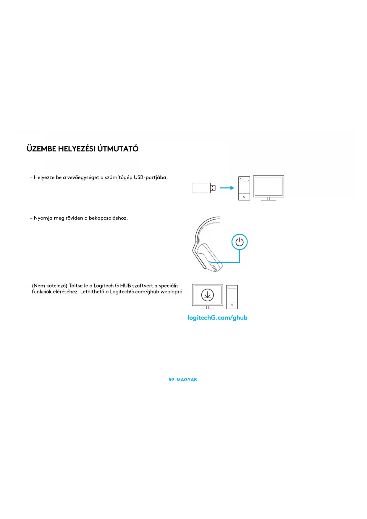 – Helyezze be a vevőegységet a számítógép USB-portjába. – Nyomja meg röviden a bekapcsoláshoz. – (Nem kötelező) Töltse le a Logitech G HUB szoftvert aspeciális funkciók eléréséhez. Letölthető a LogitechG.com/ghub weblapról. logitechG.com/ghub60 MAGYAR – A fülpárnák felfelé és lefelé állíthatók. – A fejpánt hossza állítható.61 MAGYAR – Billentse felfelé a mikrofonkart a némításhoz. – Ha alacsony az akkumulátor töltöttsége, töltseamikrofonos fejhallgatót.62 MAGYAR JELLEMZŐK 1 Állítható, kifordítható felfüggesztő fejpánt 2 Memóriahabos fülpárnák 3 40 mm-es hangsugárzók 4 Fülön állítható hangerőszabályzó 5 Felbillentéssel némítható 6 mm-es mikrofon 6 USB-C töltőaljzat