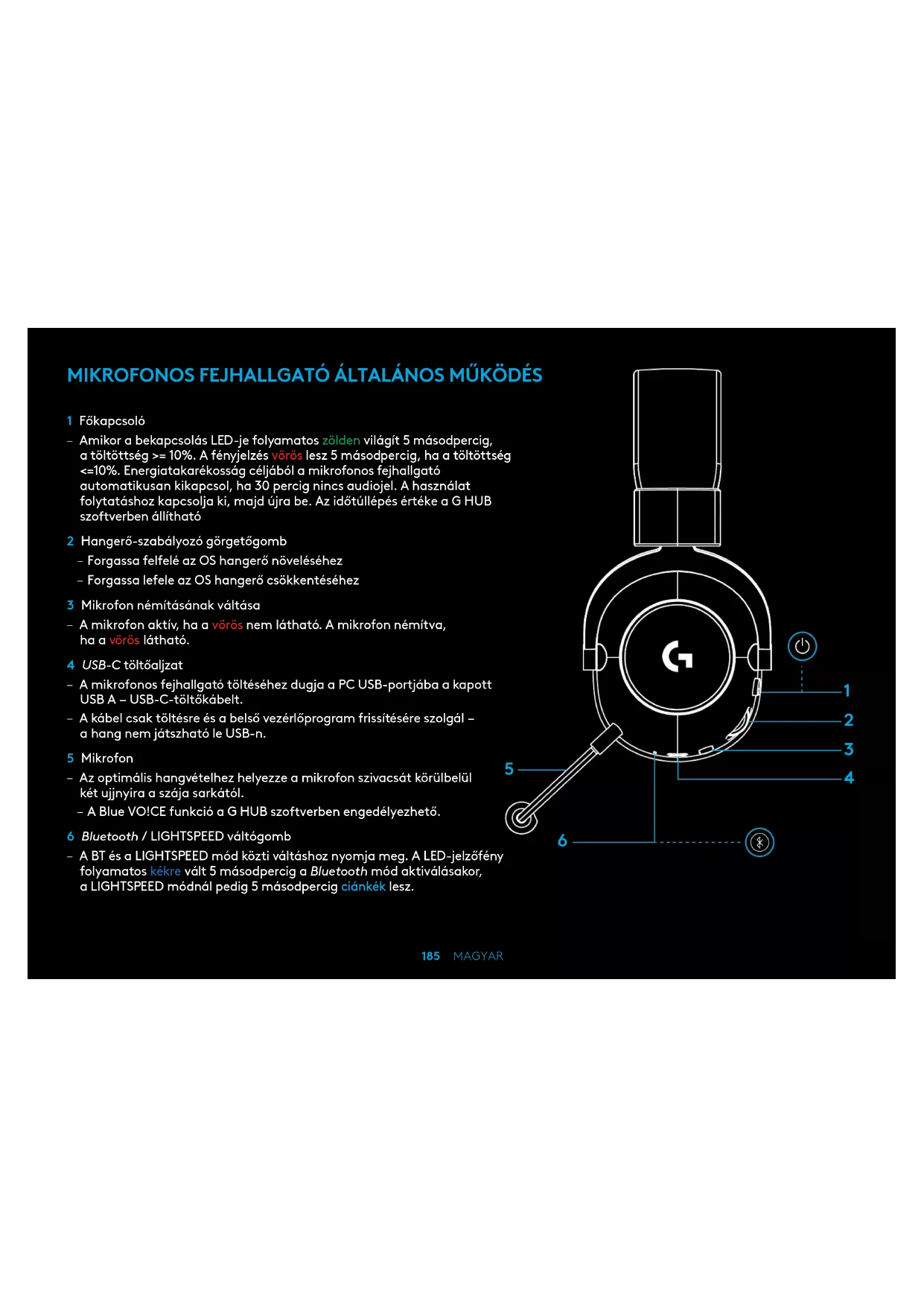 3 Podłącz drugi koniec dołączonego kabla 3,5 mm do gniazda 3,5 mm w urządzeniu źródłowym audio183 PO POLSKU JAK UZYSKAĆ MUX W ŹRÓDLE AUX 1 Zestaw słuchawkowy musi być skongurowany wtrybieLIGHTSPEED 2 Podłącz jeden koniec dołączonego kabla 3,5 mm do portu 3,5 mm w adapterze bezprzewodowym LIGHTSPEED184 PO POLSKU 3 Podłącz drugi koniec dołączonego kabla 3,5 mm do portu 3,5 mm źródła dźwięku, które chcesz multipleksować dosygnału bezprzewodowego. Źródło MUX pozostanie na stałym poziomie głośności, natomiast głośność sygnału bezprzewodowego można regulować za pomocą pokrętła głośności. music video pictures social radio podcasts marketplace185 MAGYAR MIKROFONOS FEJHALLGATÓ ÁLTALÁNOS MŰKÖDÉS 1 Főkapcsoló – Amikor a bekapcsolás LED-je folyamatos zölden világít 5 másodpercig, atöltöttség >= 10%. A fényjelzés vörös lesz 5 másodpercig, ha atöltöttség <=10%. Energiatakarékosság céljából a mikrofonos fejhallgató automatikusan kikapcsol, ha 30 percig nincs audiojel. A használat folytatáshoz kapcsolja ki, majd újra be. Az időtúllépés értéke a G HUB szoverben állítható 2 Hangerő-szabályozó görgetőgomb – Forgassa felfelé az OS hangerő növeléséhez – Forgassa lefele az OS hangerő csökkentéséhez 3 Mikrofon némításának váltása – A mikrofon aktív, ha a vörös nem látható. A mikrofon némítva, haavöröslátható. 4 USB-C töltőaljzat – A mikrofonos fejhallgató töltéséhez dugja a PC USB-portjába a kapott USB A – USB-C-töltőkábelt. – A kábel csak töltésre és a belső vezérlőprogram frissítésére szolgál – ahang nem játszható le USB-n. 5 Mikrofon – Az optimális hangvételhez helyezze a mikrofon szivacsát körülbelül kétujjnyira a szája sarkától. – A Blue VO!CE funkció a G HUB szoverben engedélyezhető. 6 Bluetooth / LIGHTSPEED váltógomb – A BT és a LIGHTSPEED mód közti váltáshoz nyomja meg. A LED-jelzőfény folyamatos kékre vált 5 másodpercig a Bluetooth mód aktiválásakor, aLIGHTSPEED módnál pedig 5 másodpercig ciánkék lesz.