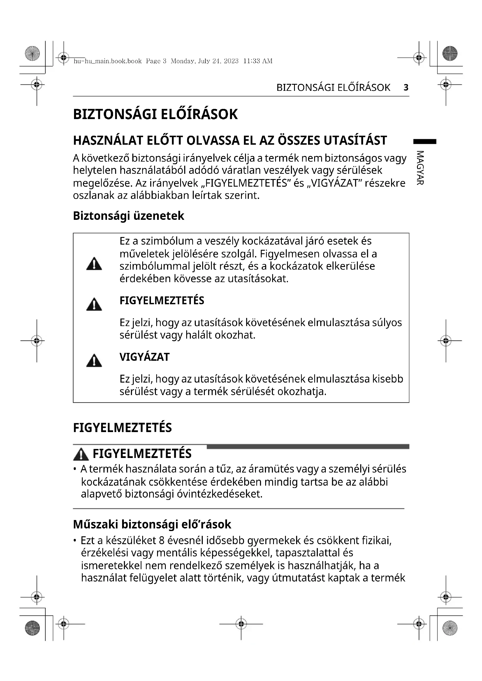 - Ezt a készüléket 8 évesnél idősebb gyermekek és csökkent fizikai, érzékelési vagy mentális képességekkel, tapasztalattal és ismeretekkel nem rendelkező személyek is használhatják, ha a használat felügyelet alatt történik, vagy útmutatást kaptak a termék Ez a szimbólum a veszély kockázatával járó esetek és műveletek jelölésére szolgál. Figyelmesen olvassa el a szimbólummal jelölt részt, és a kockázatok elkerülése érdekében kövesse az utasításokat. FIGYELMEZTETÉS Ez jelzi, hogy az utasítások követésének elmulasztása súlyos sérülést vagy halált okozhat. VIGYÁZAT Ez jelzi, hogy az utasítások követésének elmulasztása kisebb sérülést vagy a termék sérülését okozhatja. hu-hu_main.book.book Page 3 Monday, July 24, 2023 11:33 AM4