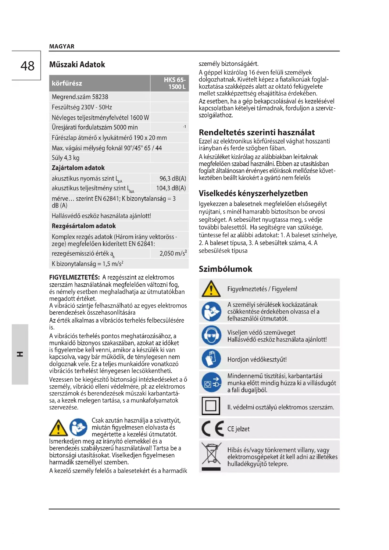 MAGYAR Műszaki Adatok körfűrész HKS 65- 1500 L Megrend.szám 58238 Feszültség 230V - 50Hz Névleges teljesítményfelvétel 1600 W Üresjárati fordulatszám 5000 min